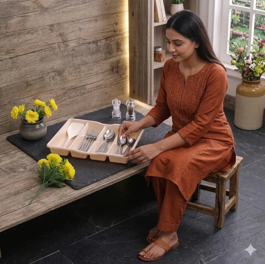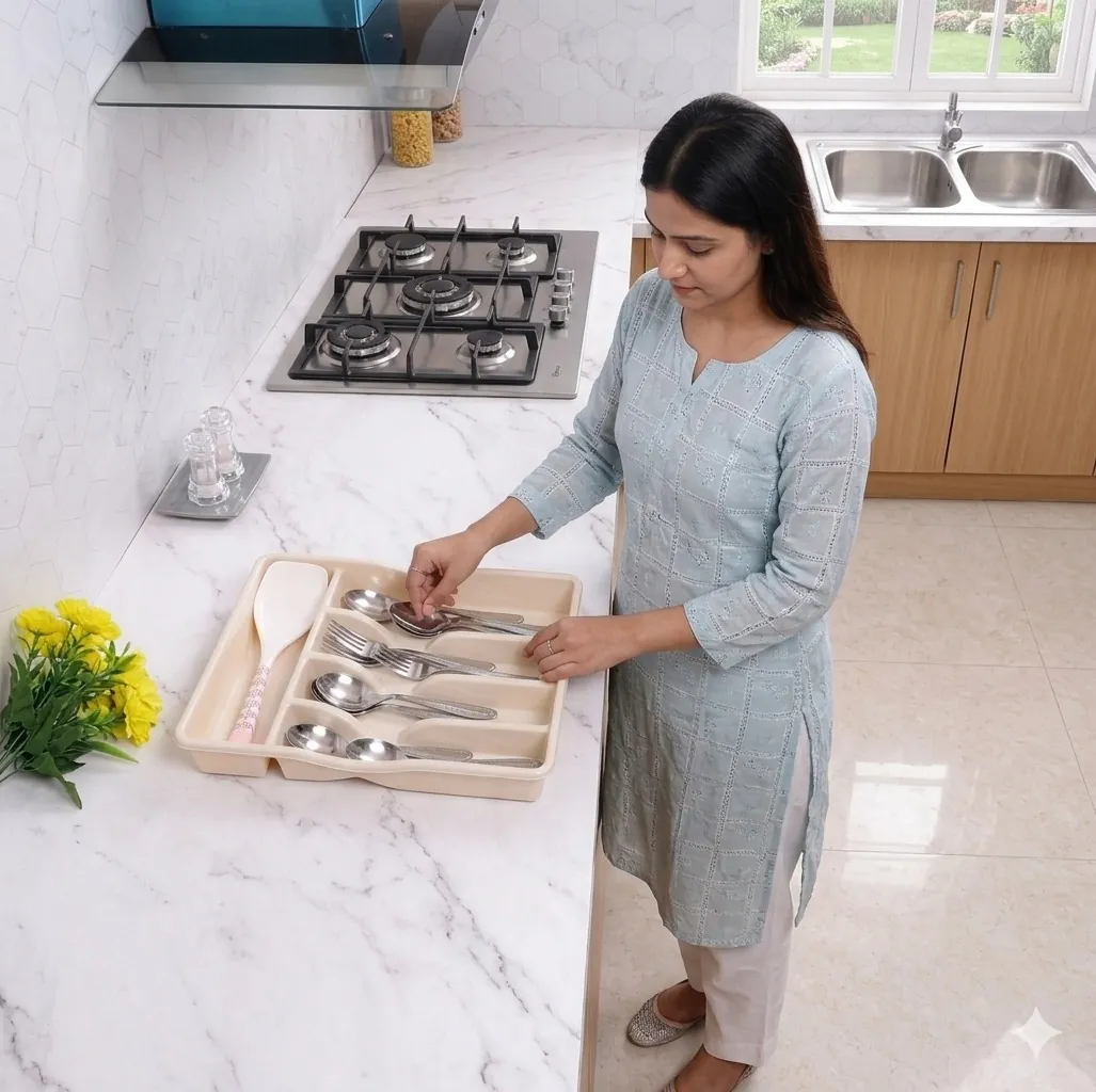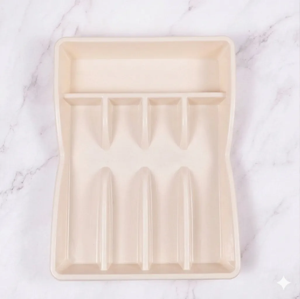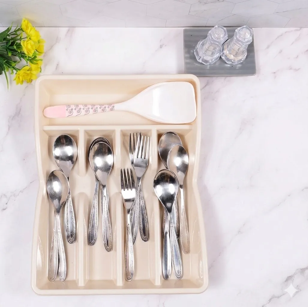 Crafted from premium, impact-resistant plastic, this tray is designed to withstand the daily wear and tear of a busy household. It features five distinct compartments: four vertical slots specifically sized for dinner spoons, teaspoons, and forks, plus an extra-wide top compartment that accommodates oversized utensils like rice paddles, whisks, or tongs. The sleek cream finish and elegant curved edges ensure it fits seamlessly into any decor style while keeping your essentials within reach.