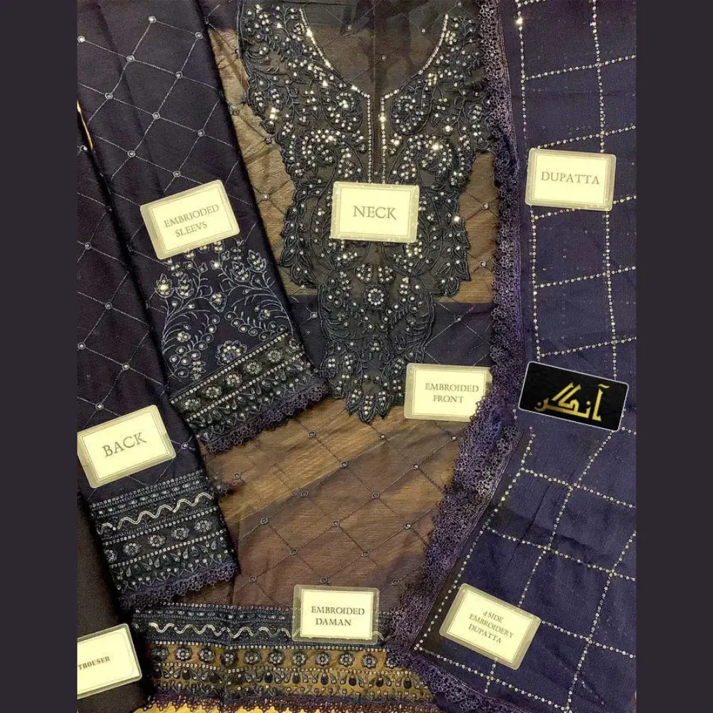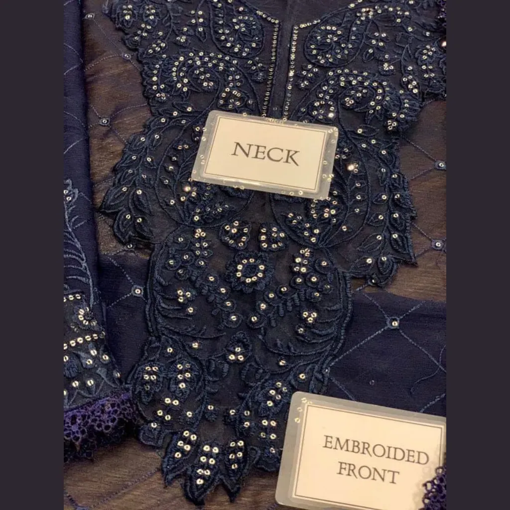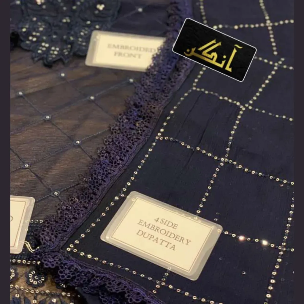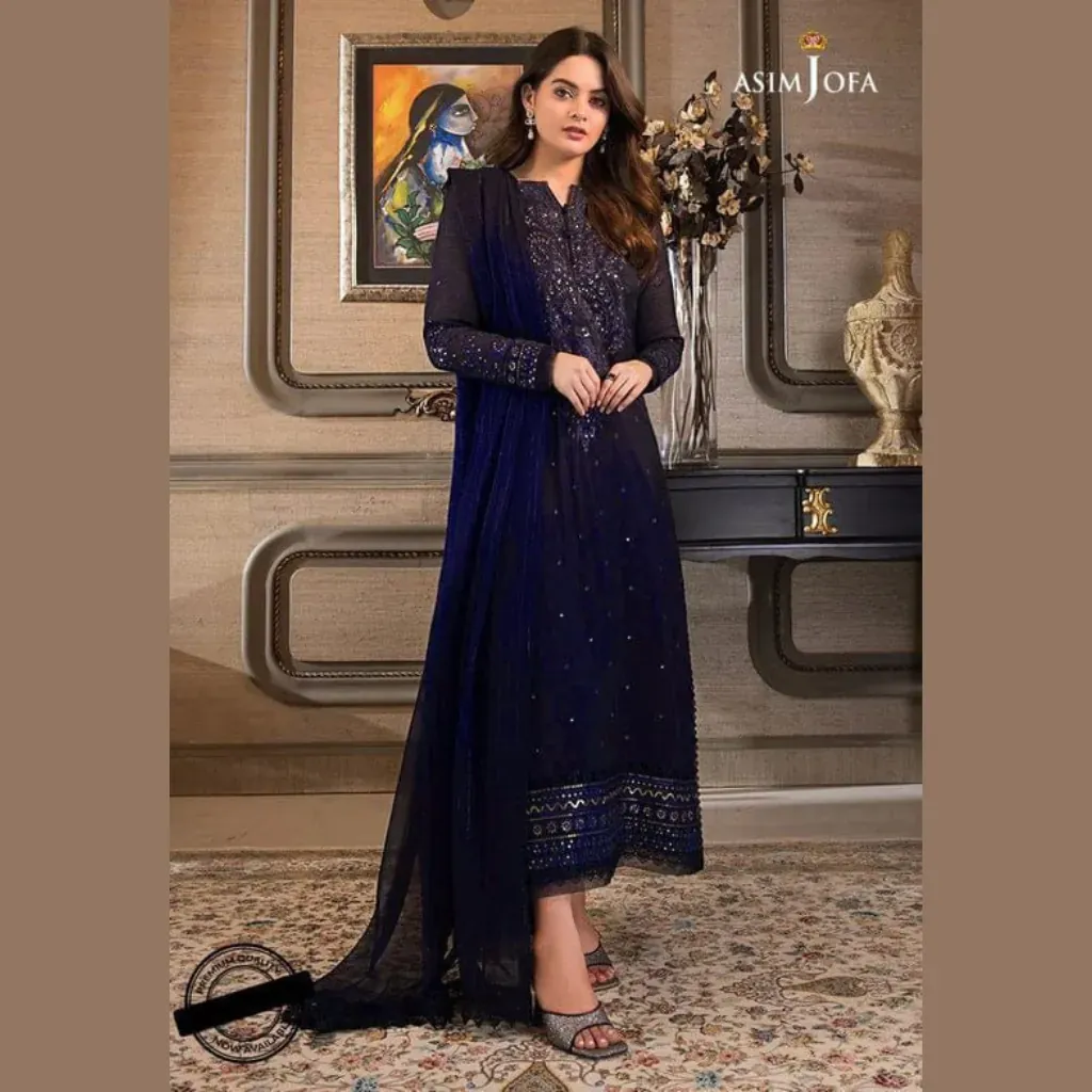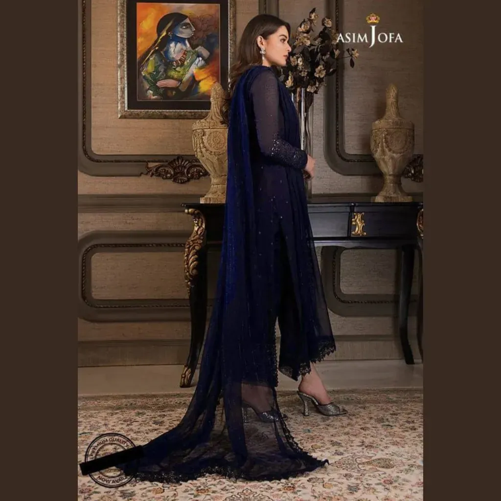 Step into timeless elegance with this Asim Jofa Chiffon Embroidered 3Pc Suit. Designed with sequence embroidery on both front & back, embroidered neckline and daman patches, and a stunning embroidered chiffon dupatta. Paired with a plain malai trouser for a graceful festive look.
