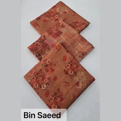 Experience the beauty of Bin Saeed Lawn 2025 with this exquisite 3-piece unstitched printed lawn suit for women. The set includes fabric for the shirt, dupatta (scarf), and trousers, all adorned with a charming floral print on high-quality, breathable lawn material. This unstitched fabric offers the versatility to tailor the suit to your desired style and fit, making it ideal for warm weather occasions. The delicate floral patterns are a hallmark of Bin Saeed's elegant designs. Elevate your wardrobe with this exquisite 3-piece unstitched suit from the latest Bin Saeed collection. Designed for the modern woman who appreciates a blend of traditional elegance and contemporary style, this outfit is a must-have for your everyday or casual wear. The fabric set includes a beautifully printed shirt, a complementary dupatta, and a trouser piece, offering you the freedom to create a custom-fit ensemble.