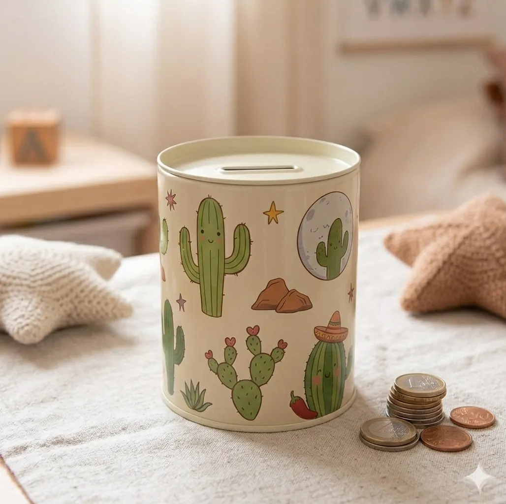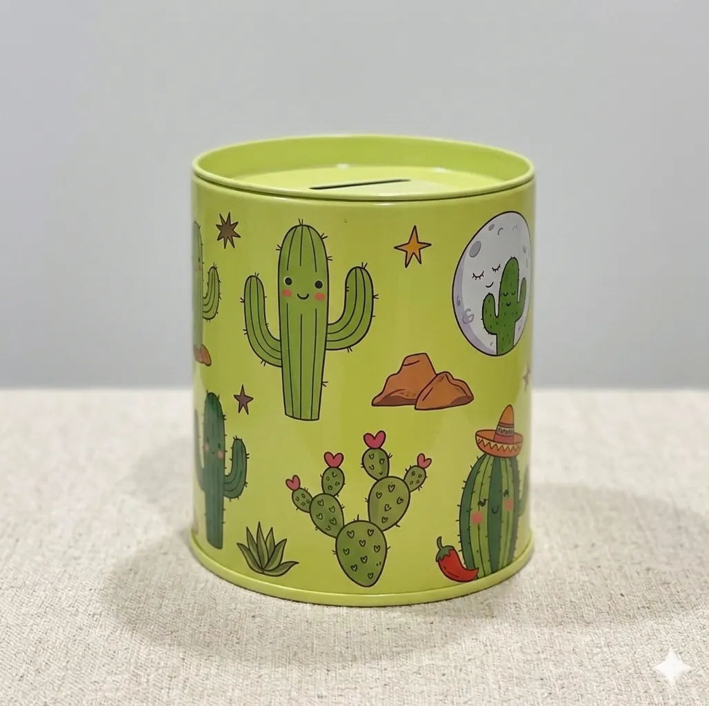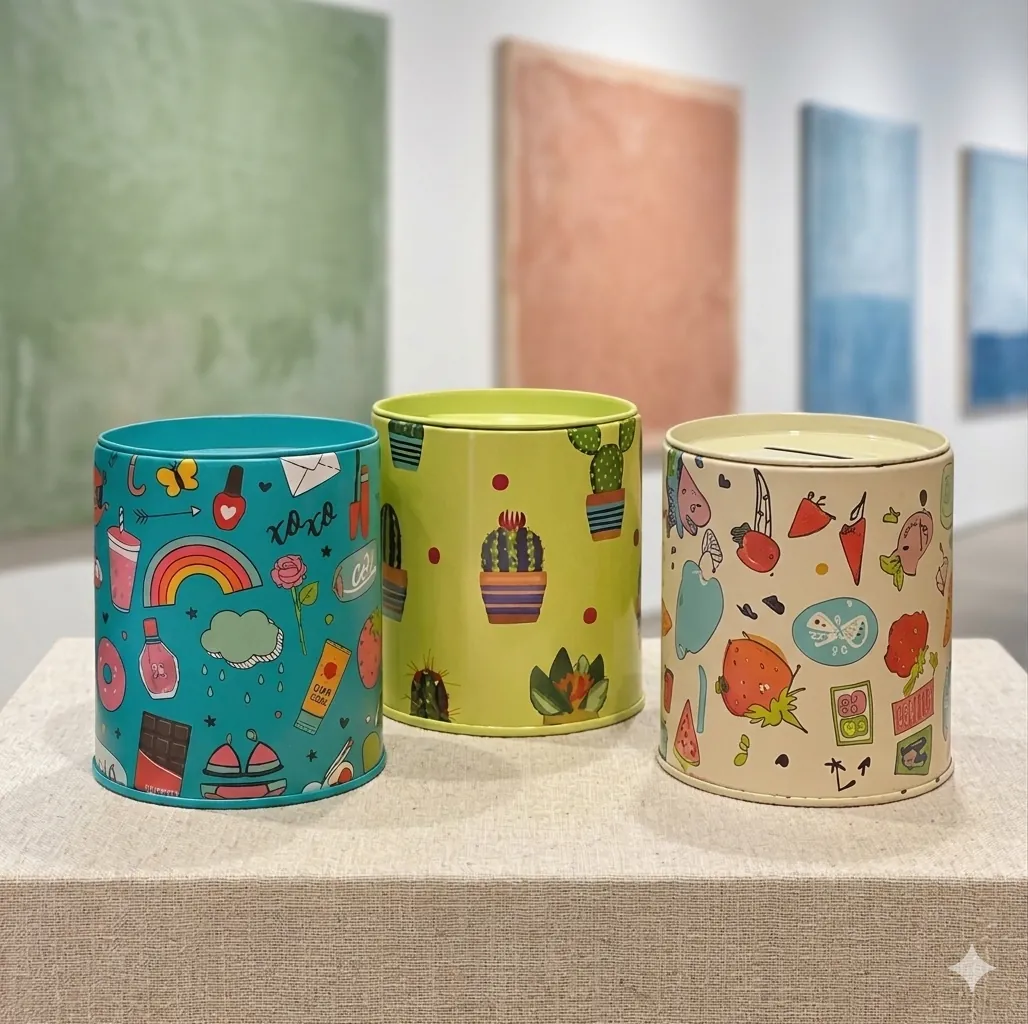 Premium Decorative Round Tin Money Box / Piggy Bank – Kids & Adults Coin Saving BankTransform the way you save with our Premium Round Tin Money Box, a perfect blend of artistic flair and practical utility. Designed for those who appreciate both style and substance, this money box serves as an excellent motivational tool for children and a chic desk accessory for adults. Unlike traditional plastic piggy banks that wear out or ceramic ones that shatter easily, our money box is constructed from high-density reinforced tinplate, ensuring it stays part of your journey for years to come.The exterior is wrapped in high-definition, wrap-around graphics featuring trendy motifs—from minimalist cacti to whimsical rainbows—making it a standout piece in any modern interior. It is specifically designed without a bottom plug to encourage "True Saving"; by making the contents less accessible, it helps children (and even adults!) resist the temptation to dip into their savings before their goal is reached. Whether you are saving for a new toy, a travel fund, or just organizing your loose change, this cylinder bank provides a secure, stylish, and unbreakable vault for your hard-earned money.