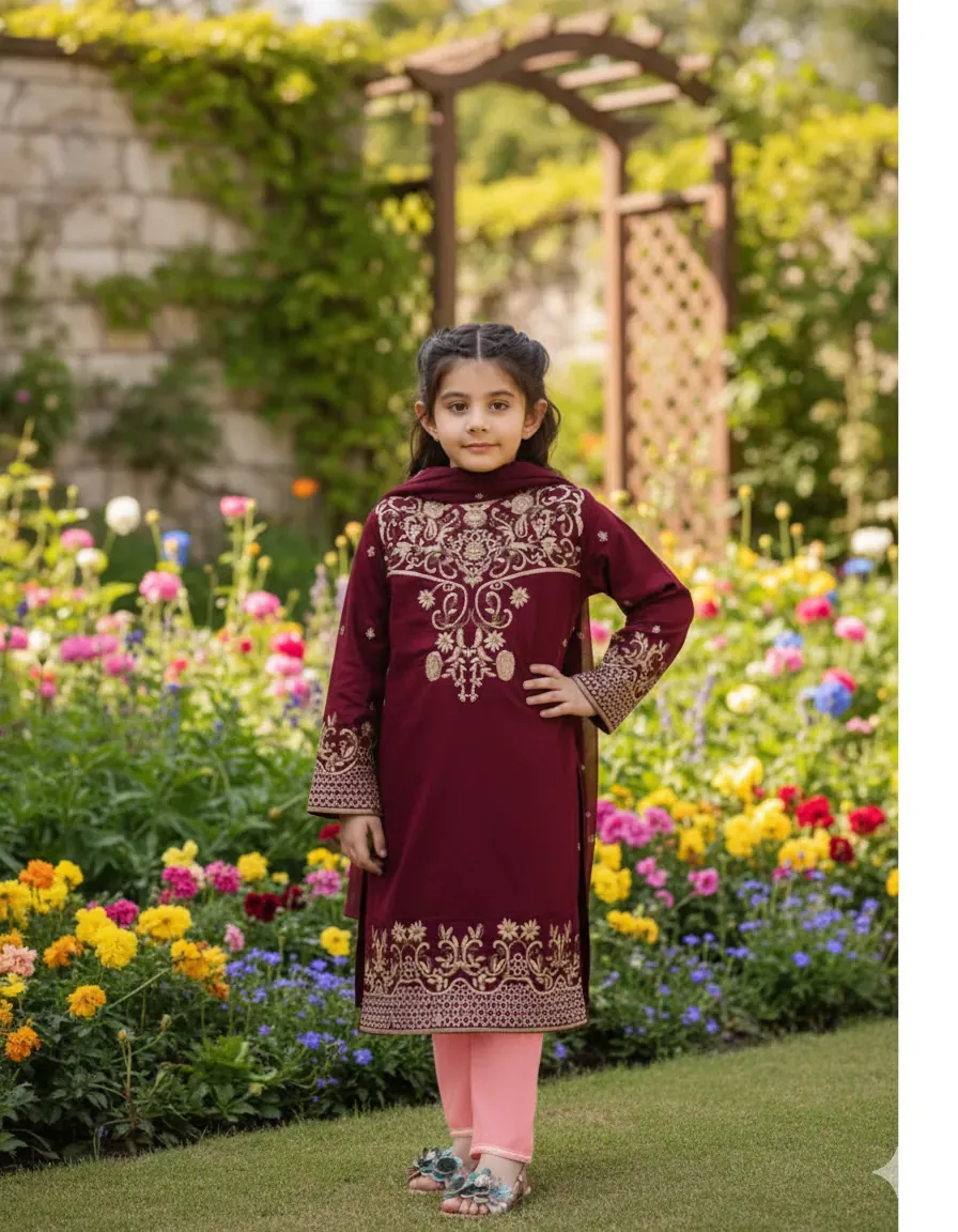Premium Dhanak Kids 2-Piece Embroidered Winter Suit – Full Embroidery, Sequin Work & Designer Patches