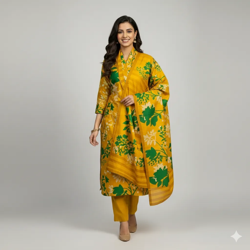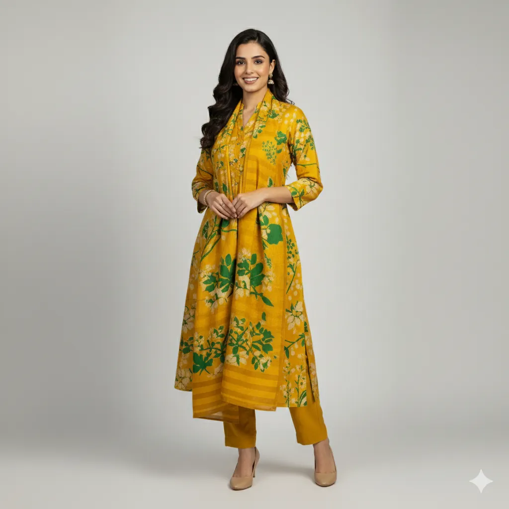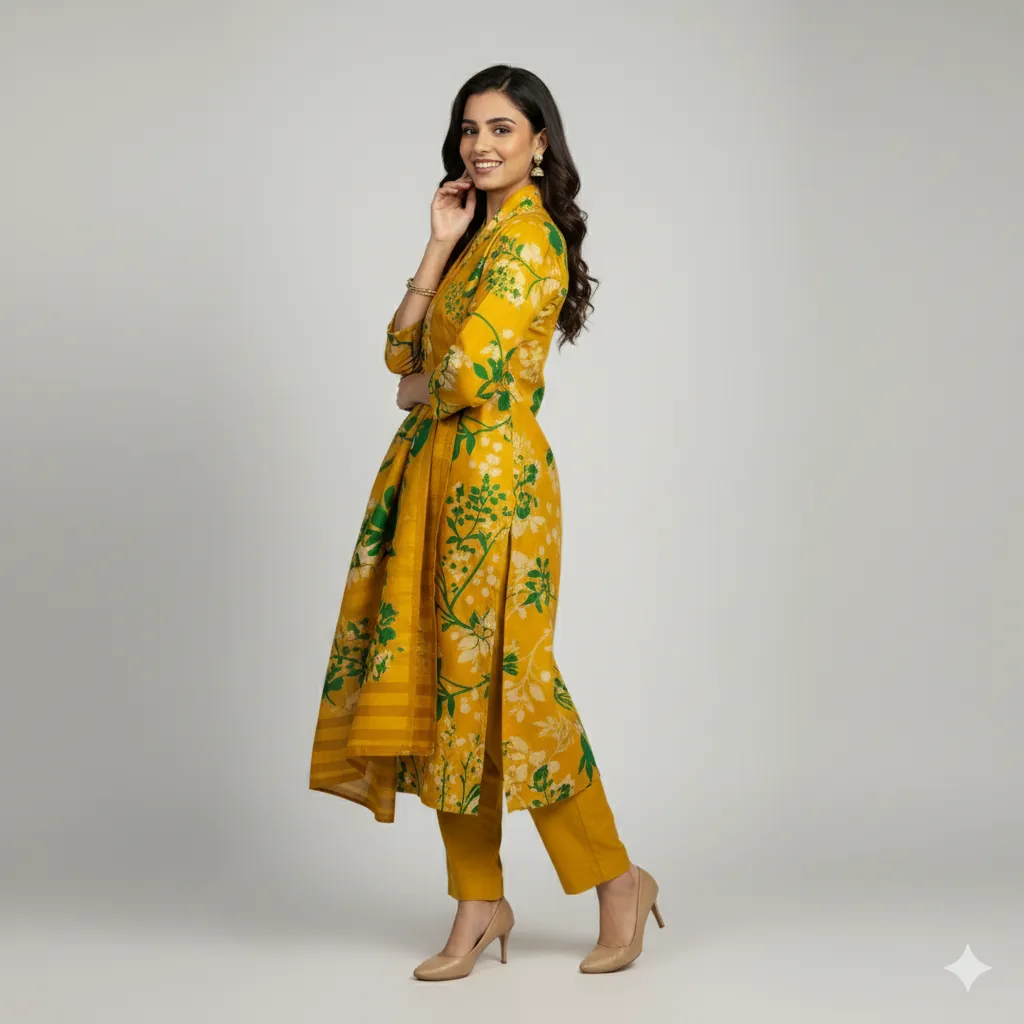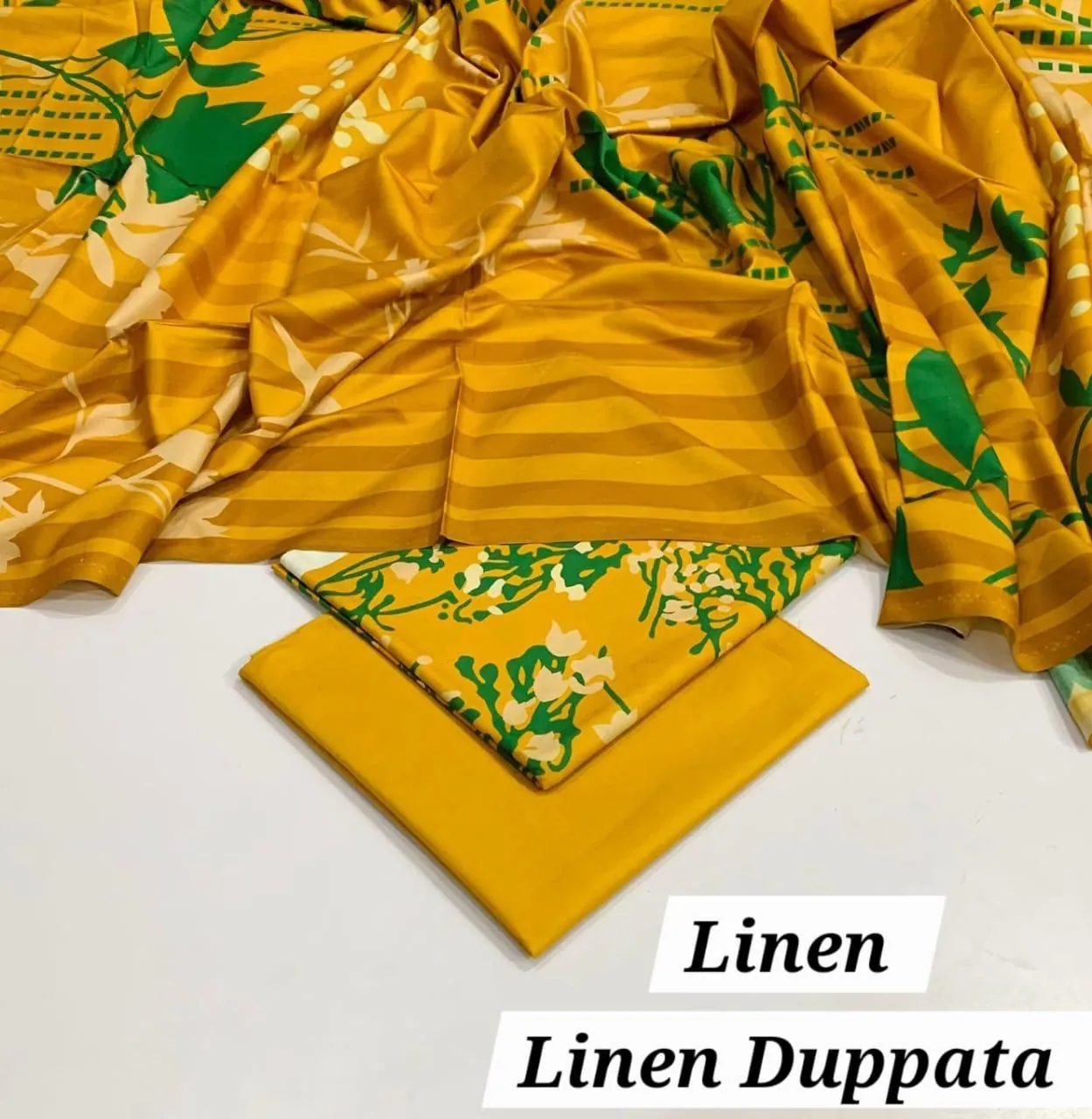 Completing the ensemble is a matching digital printed linen dupatta that drapes beautifully and carries the elegant design, tying the whole look together. A pair of solid-dyed linen trousers in a complementary beige provides a perfect, balanced foundation for the vibrant prints. Being unstitched, this suit offers you the creative freedom to tailor it to your exact measurements and style.