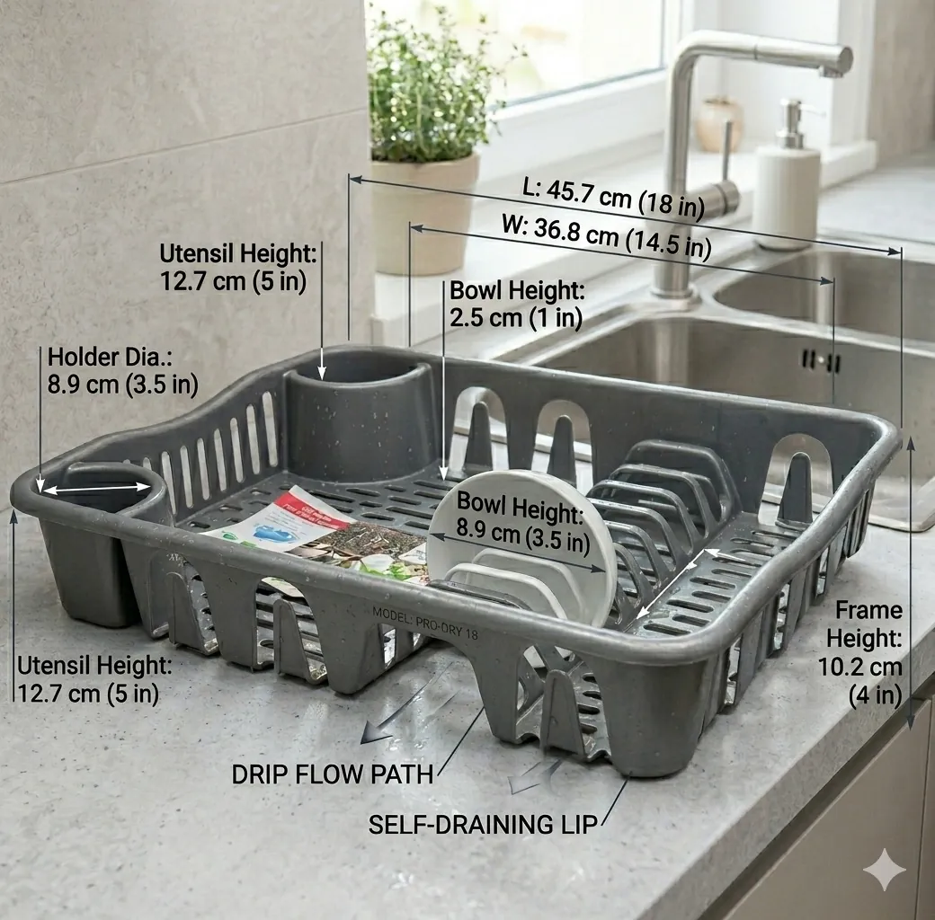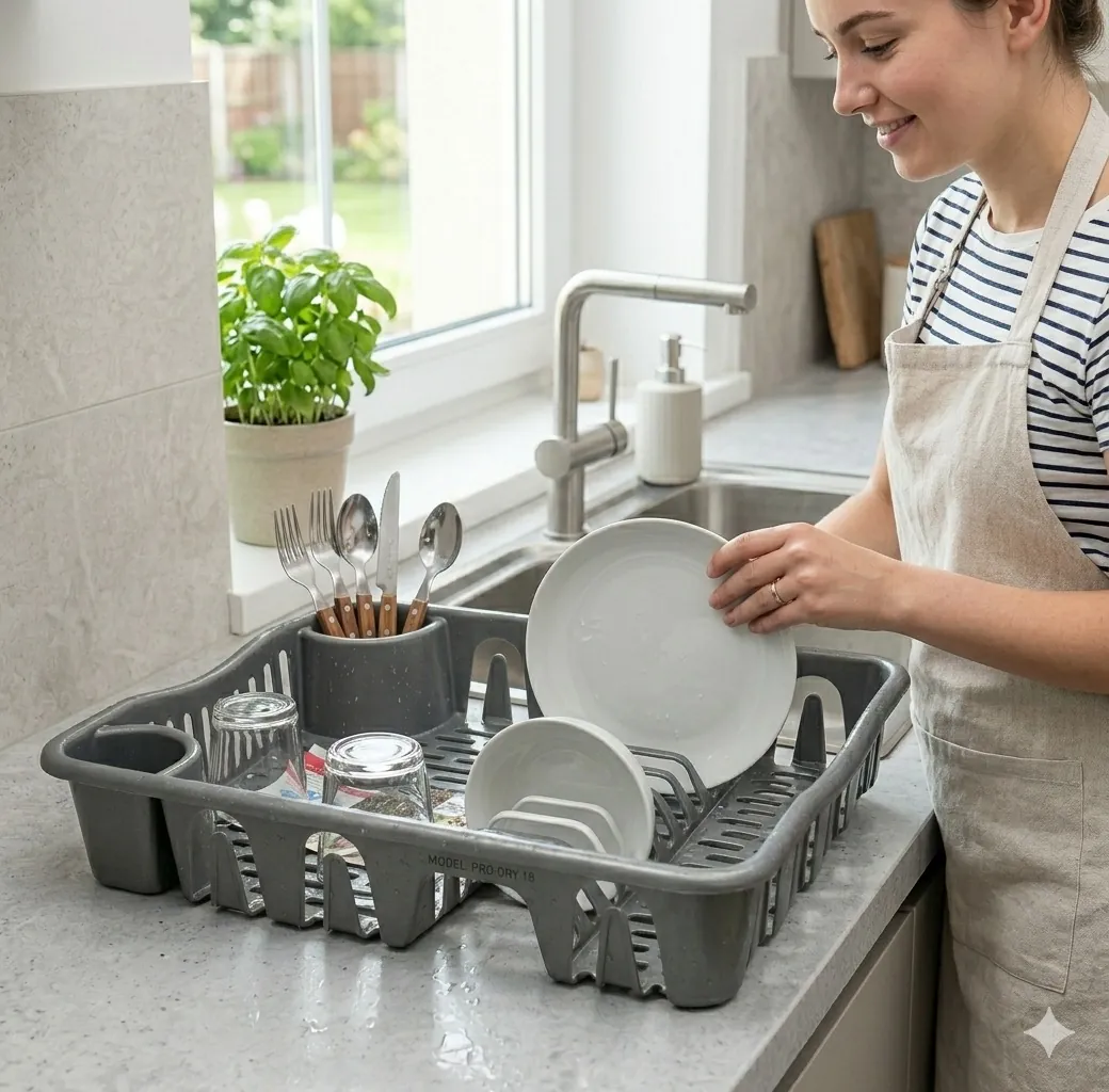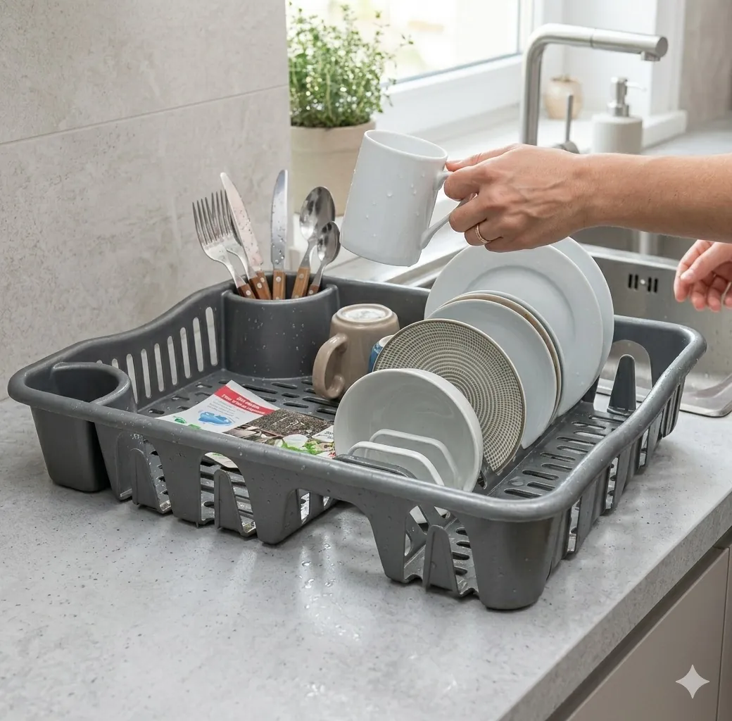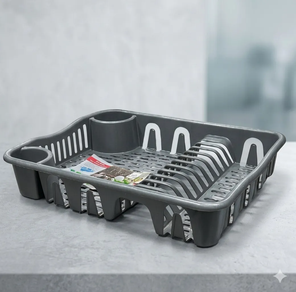 Efficiency meets style with our Grey Plastic Dish Drying Rack. This essential kitchen organizer is crafted from sturdy, moisture-resistant plastic designed to withstand daily use. The intelligent layout includes a series of raised slats to securely hold plates upright for faster air-drying, while two built-in corner compartments keep spoons, forks, and knives organized. The open-slat base promotes maximum airflow and ensures water drains away easily, preventing stagnant water and keeping your kitchen hygienic. Its neutral grey finish complements any kitchen decor, and its compact footprint makes it ideal for apartments, RVs, or small kitchen spaces. Simple to clean and built to last, this dish drainer is a must-have for a tidy home.