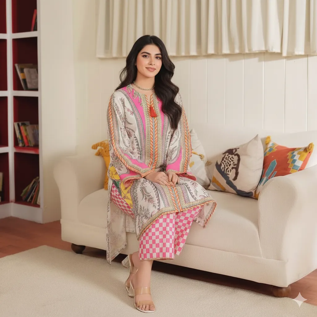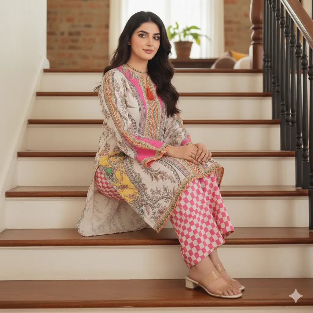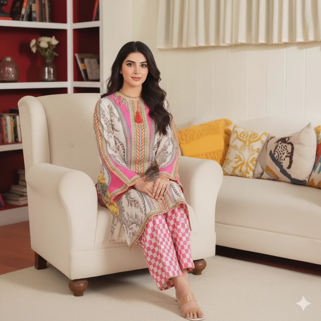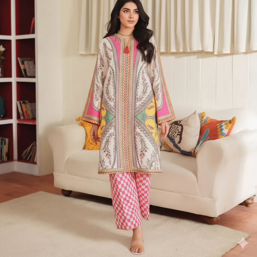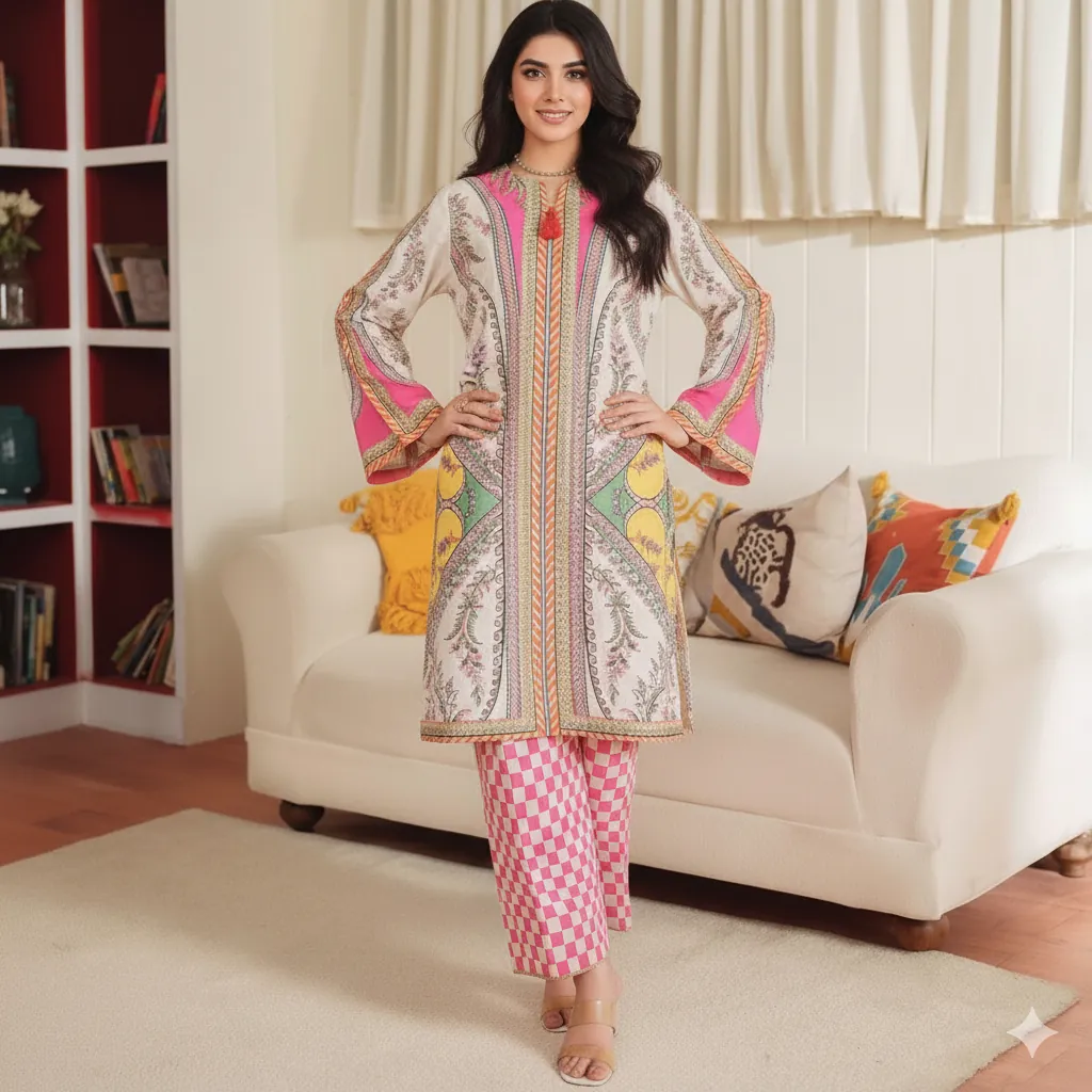 Premium Grip 2PC Stitched Suit: Elegant White & Pink Paisley Print Kurta with Check Trousers.This is a stunning, stitched 2-piece suit, perfect for adding a fresh look to your daily wardrobe. It is made from our best-quality Premium Grip fabric, which is soft, comfortable, and drapes well. The high-quality stitching ensures a neat and polished finish, ready to wear right out of the package.The Kurta design is very attractive. It has a white background with a beautiful paisley print in rich shades of pink, orange, and gold. The sophisticated straight-cut offers a flattering silhouette. The neckline features a small V-cut and is completed with a lovely tassel detail for an elegant touch.The matching straight trousers are simple in cut but have a trendy look, featuring a bold pink and white checkered (check) pattern. This clever mix of the classic paisley and the modern check print makes the suit very stylish and unique.Designed for comfort in a Standard Medium size, this suit provides ample movement while looking put-together. If you are looking for clothing that is comfortable for all-day wear but also polished enough for the office or small functions, this versatile suit is the perfect choice for you. Pair it with simple heels or traditional khussas to complete a fashion-forward ensemble.