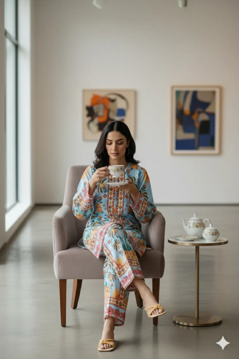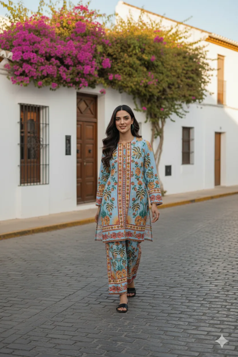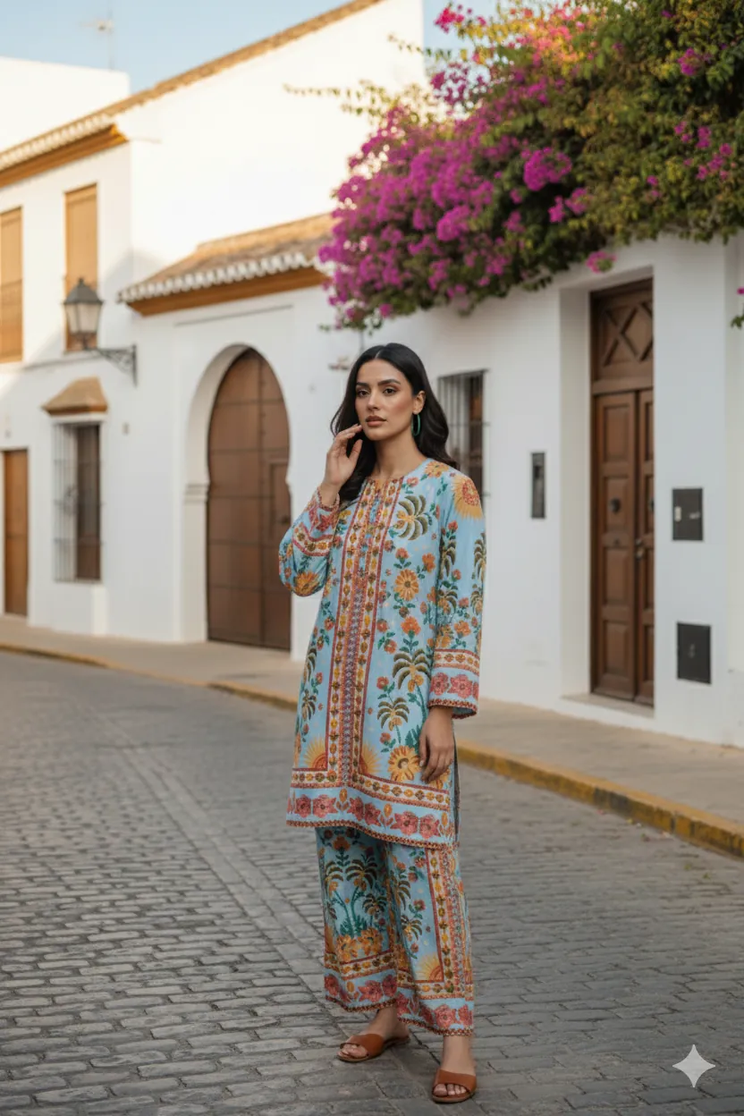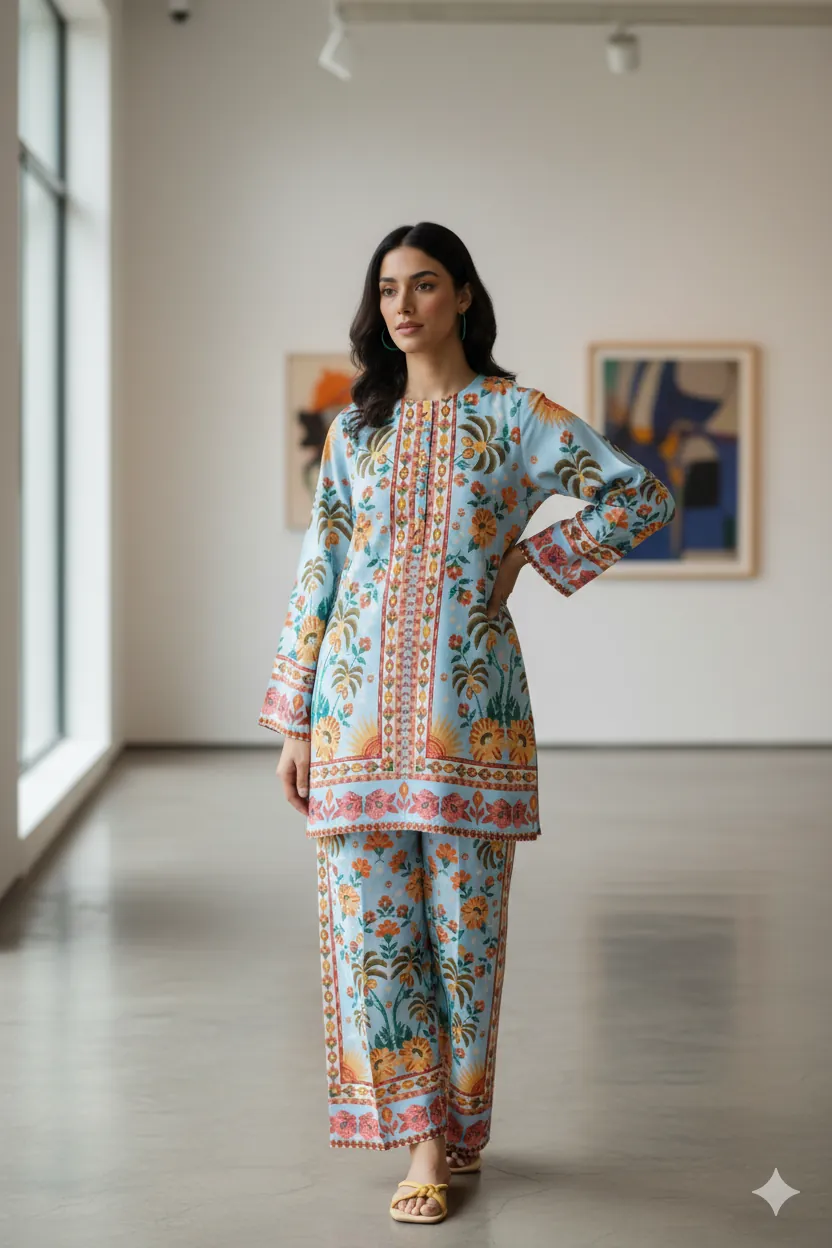 Premium Grip Fabric Stitched 2-Piece Suit - Sky Blue Tunic Shirt and Wide Trousers with Multi-Color Floral Print.Get ready for summer with this gorgeous, ready-to-wear 2-piece suit set.This outfit is completely stitched and ready to wear right out of the package—no tailoring needed! It is made from high-quality premium grip fabric, which feels comfortable and hangs nicely on your body.The suit features a stunning multi-color floral design printed on a cool sky-blue background. The vibrant colors of orange, pink, and green create a lovely, eye-catching contrast that will make you stand out. This colorful print is perfect for brightening up any casual day or event.The long shirt (tunic) has long sleeves and clean borders that frame the beautiful print. The set comes with matching wide-leg trousers that are comfortable for all-day wear.This outfit is perfect for casual events, shopping, or just looking stylish and put-together at home.