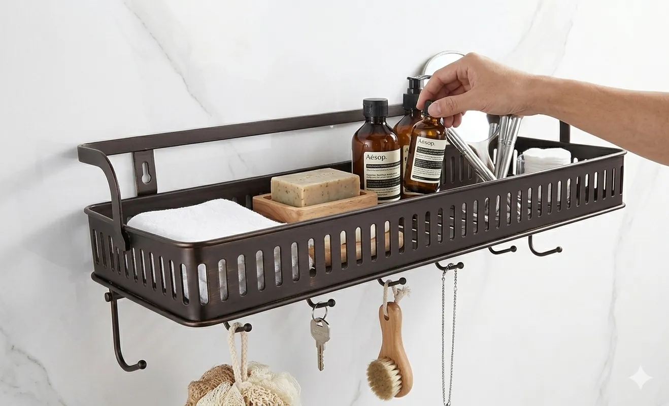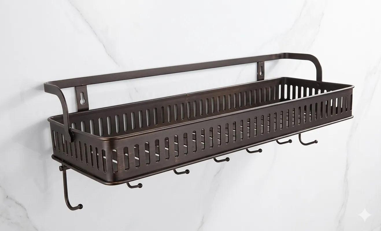 Designed for functionality, the rack features a high-walled basket to prevent items from falling and precision-cut vertical slots for superior drainage and airflow, keeping your soaps and sponges dry. Below the main compartment, six sturdy integrated hooks provide the perfect hanging solution for loofahs, brushes, washcloths, or kitchen tools.