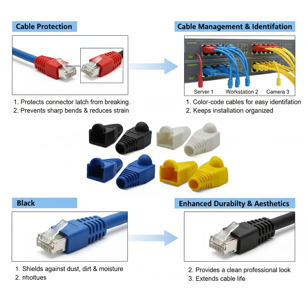 The Premium Quality RJ45 Connector Boot is an essential accessory for your Cat5e, Cat6, and even Cat6a Ethernet Patch Cables. This boot not only gives your cable installation a professional and tidy appearance but also significantly improves the longevity of your cables. It effectively protects the connector plug clip from breakage and provides crucial strain relief, minimizing damage caused by bending or pulling the cable.