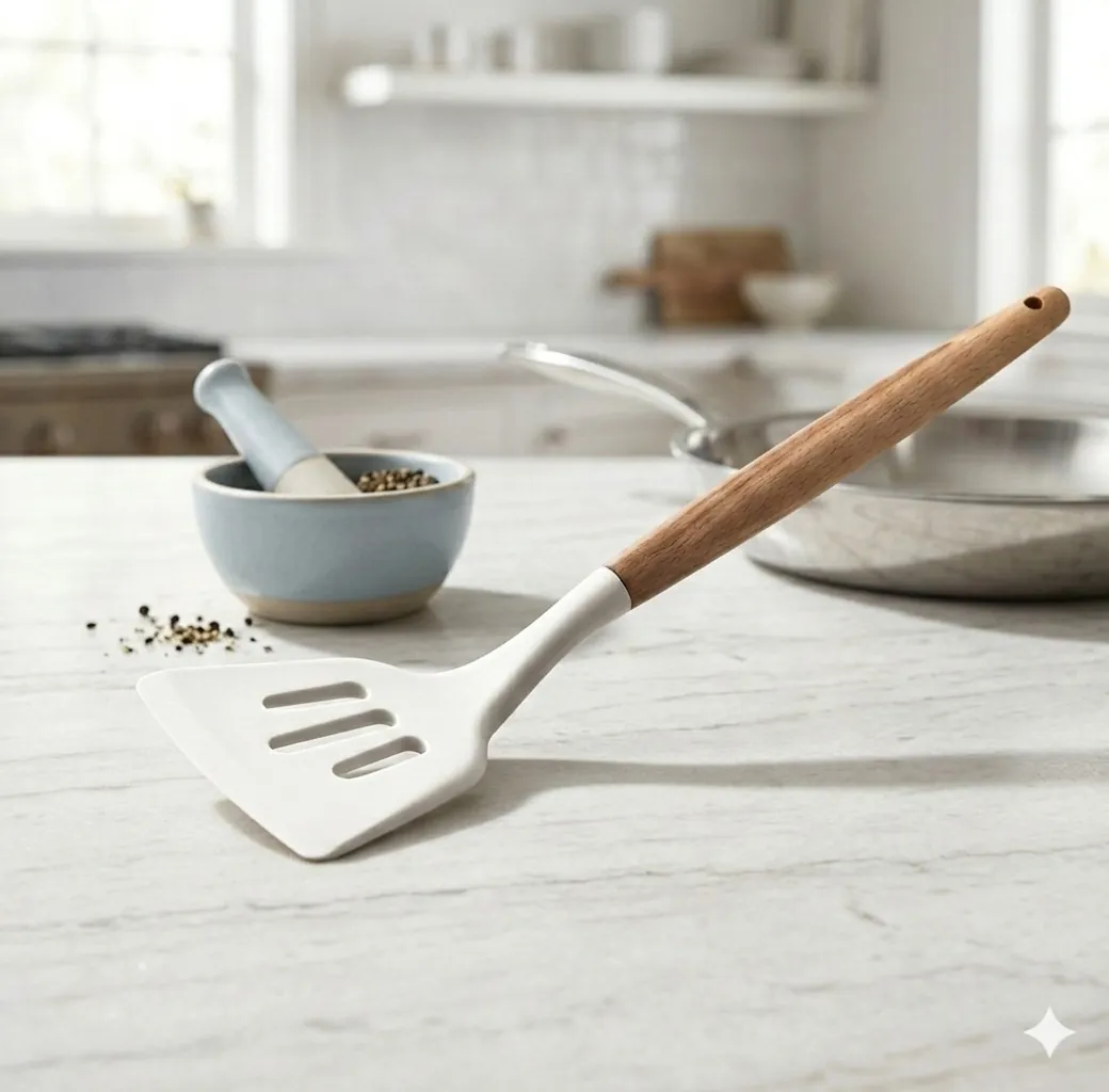 Upgrade your kitchen essentials with a tool that balances style and performance. Our Silicone Slotted Spatula is specifically engineered for the modern chef. The high-grade silicone head features three precision slots to allow excess oil and liquids to drain away effortlessly, while its thin, flexible edges slide under delicate foods like eggs and fish without breaking them.