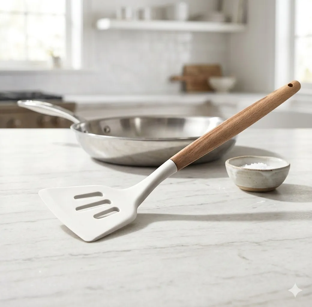 The ergonomic handle is crafted from solid, sustainably sourced beechwood, providing a comfortable, slip-resistant grip that stays cool to the touch even over high heat. Unlike plastic or metal tools, our silicone turner is 100% scratch-free, making it the perfect companion for your expensive non-stick and stainless steel pans. With a minimalist aesthetic that fits any kitchen decor, this spatula is as much a statement piece as it is a functional powerhouse.
