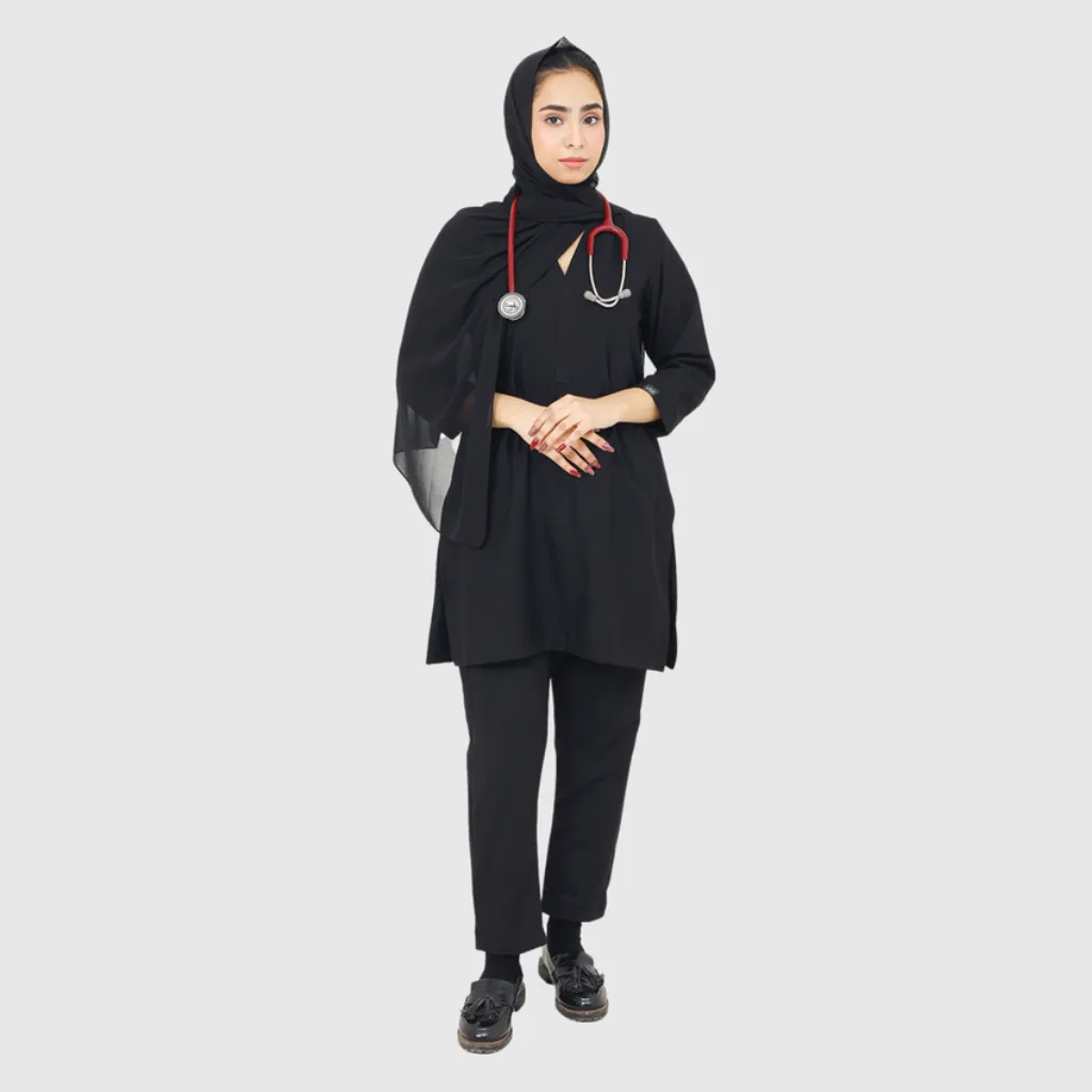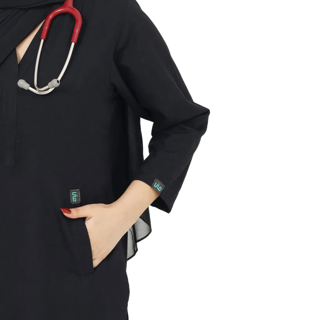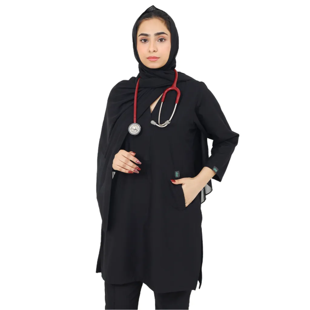 The deep jet black color adds a bold, professional look that's both timeless and sophisticated — making it a perfect choice for doctors, nurses, and frontline workers who want to look sharp while staying comfortable. The full sleeves offer added protection, while the tailored fit ensures freedom of movement and a flattering silhouette.