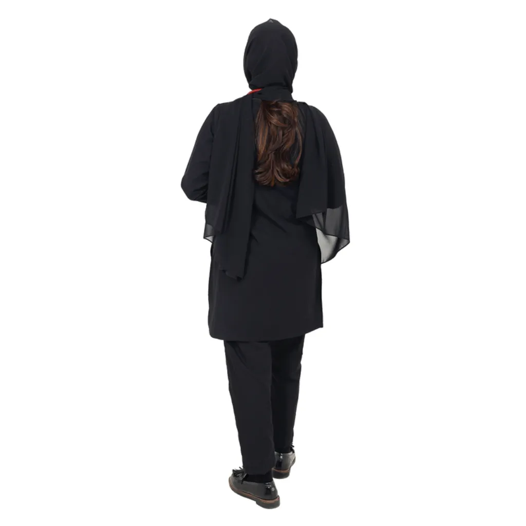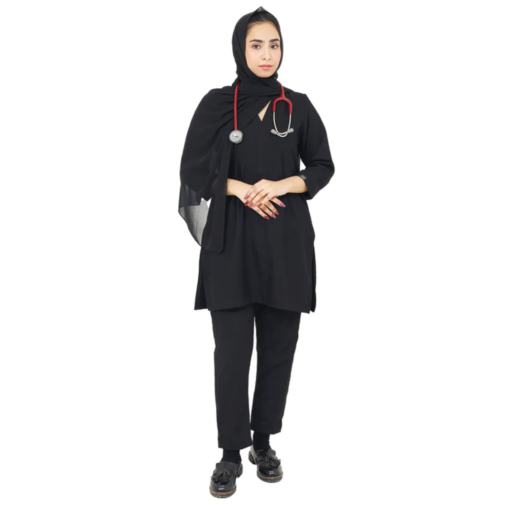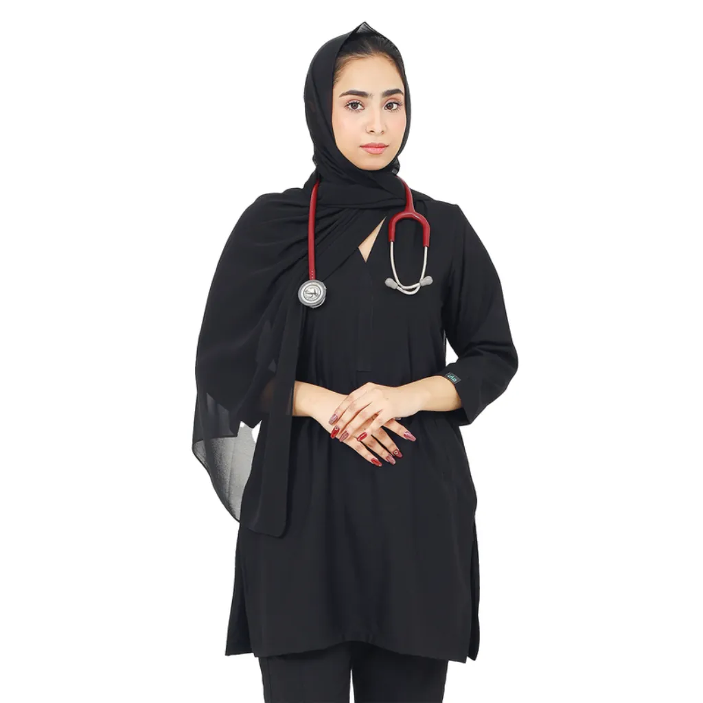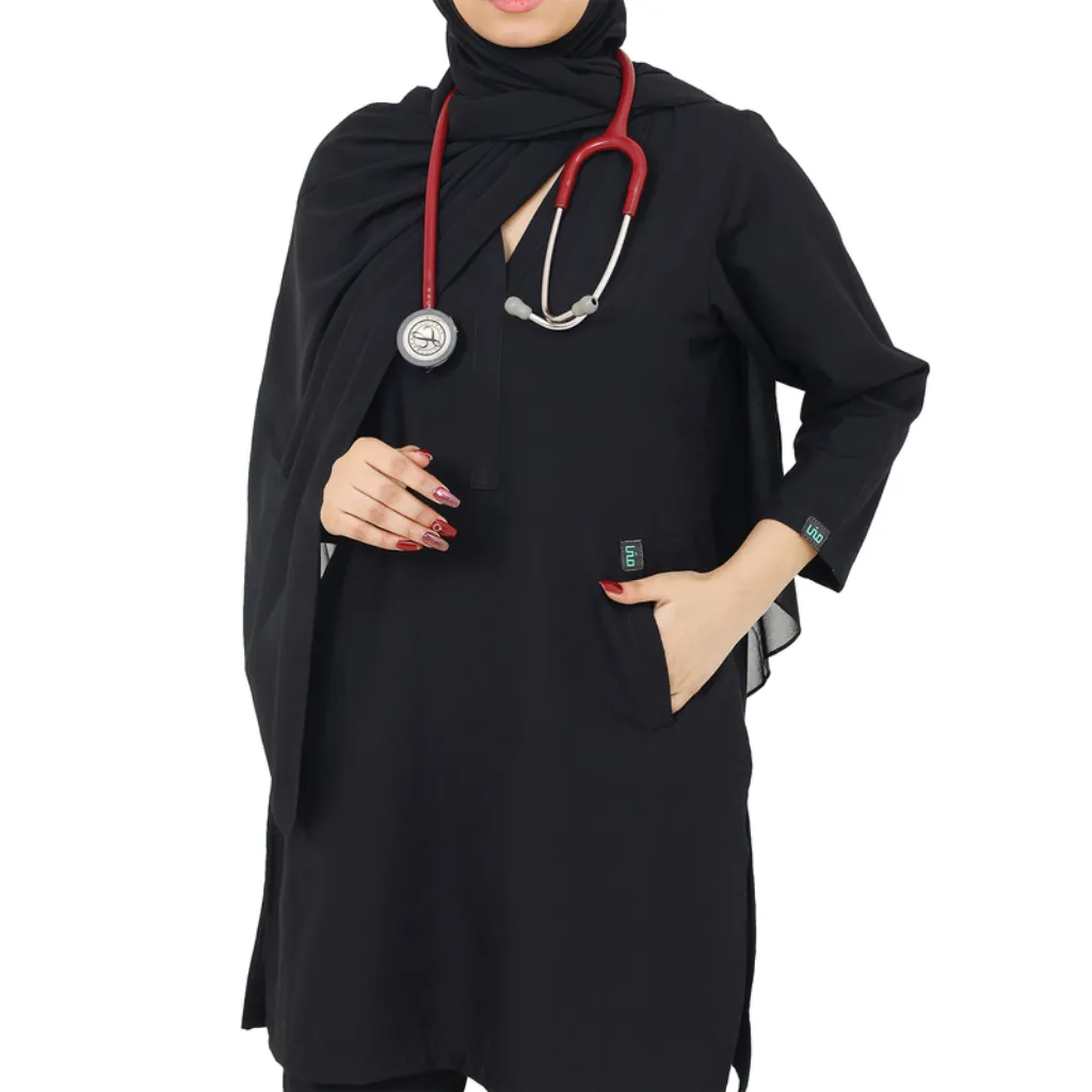 The deep jet black color adds a bold, professional look that's both timeless and sophisticated — making it a perfect choice for doctors, nurses, and frontline workers who want to look sharp while staying comfortable. The full sleeves offer added protection, while the tailored fit ensures freedom of movement and a flattering silhouette.