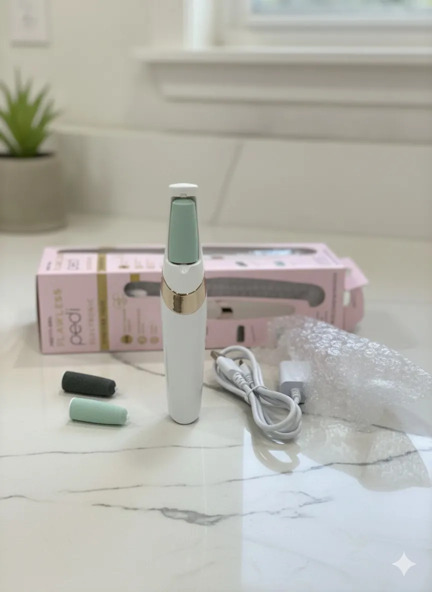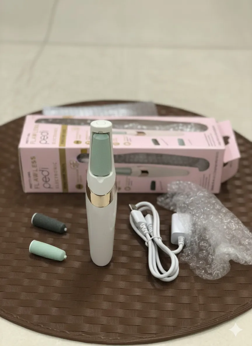 Transform your foot care routine with the PRETTY GRIL FLAWLESS Pedi Electronic Pedicure Tool. This advanced, rechargeable device is designed to effortlessly remove tough calluses, dead skin, and rough patches, revealing incredibly soft and smooth feet. Featuring an innovative "Easy Reach Design," it allows you to comfortably target all areas of your feet, ensuring a thorough pedicure every time.