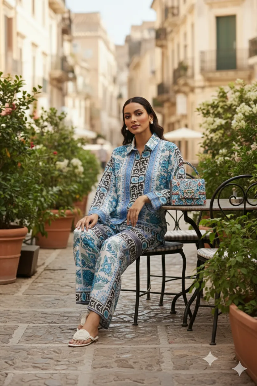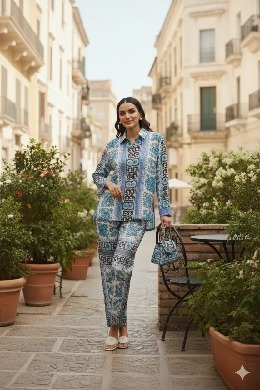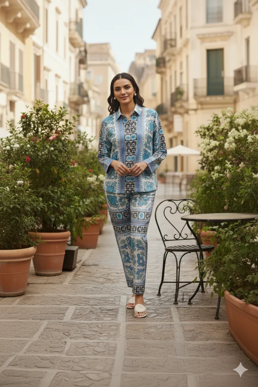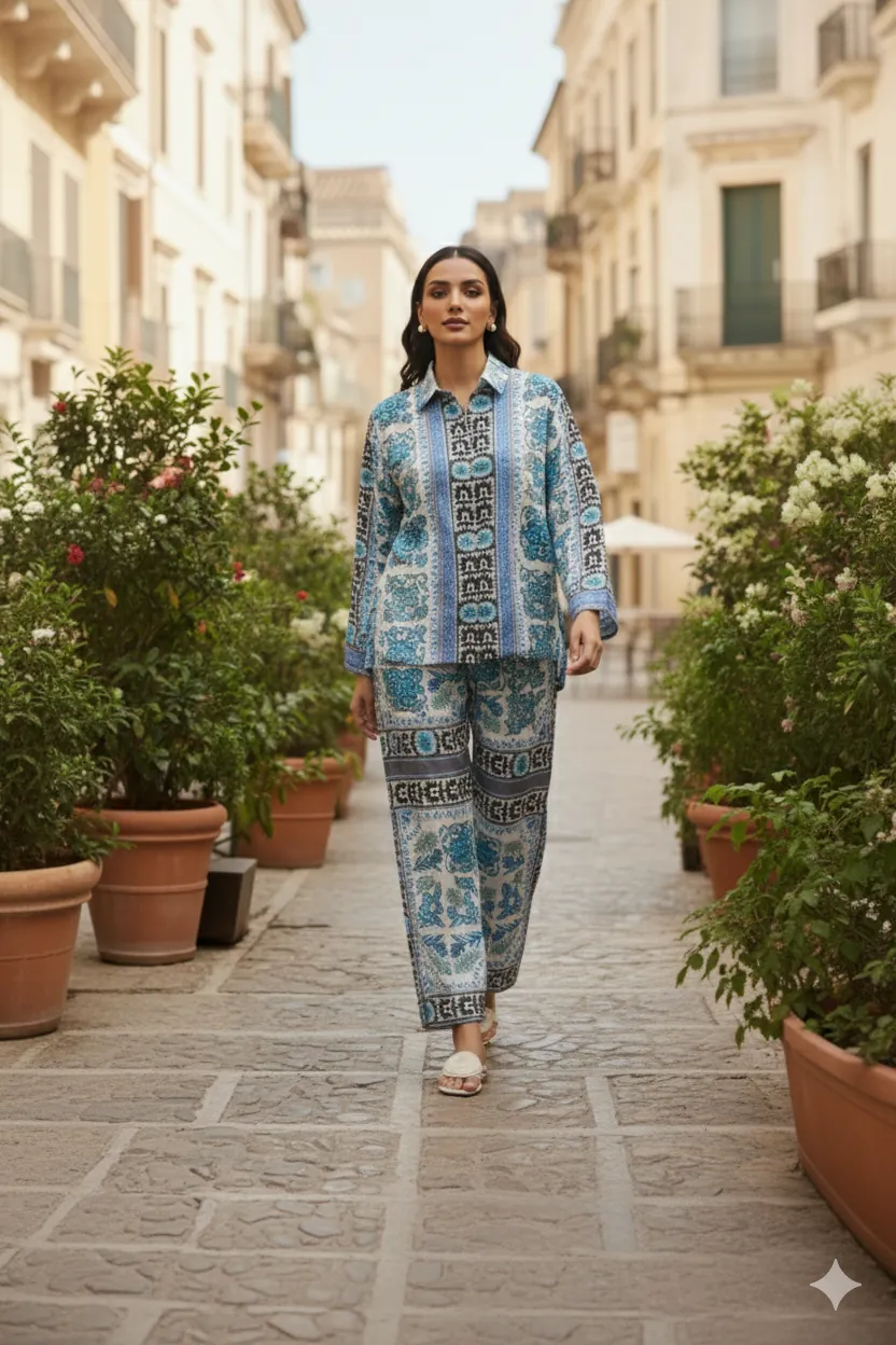 The suit features a stylish printed shirt with a classic neckline and intricate blue floral and geometric patterns that pop against a light background. The matching printed trousers are designed for a relaxed yet flattering fit, with a stretchable waist for ultimate comfort.