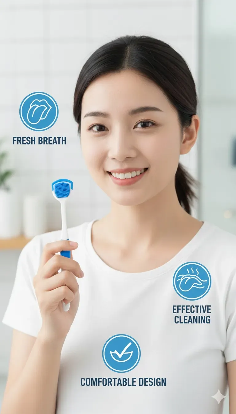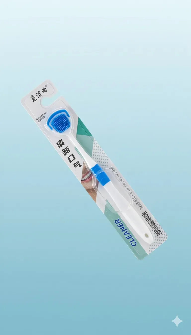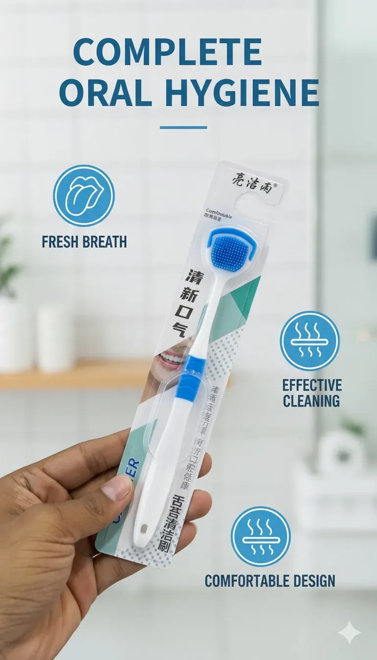 PureBreeze Dual-Action Silicone Tongue Cleaner & Scraper for Fresh Breath and Oral Hygiene.A clean tongue is essential for fighting halitosis (bad breath), and this tool is designed for maximum efficiency and comfort.The cleaner features a two-sided head .Fine Silicone Bristles: Gently massages the tongue surface and loosens bacteria, food debris, and dead cells.Smooth Scraper Edge: Effectively scrapes away the loosened film and residue for a deep clean.The ergonomic, non-slip handle ensures a secure grip for better control. Made from durable, high-quality, and easy-to-clean materials, incorporating this cleaner into your daily routine is a simple step toward a healthier mouth and long-lasting fresh breath.