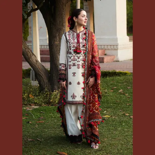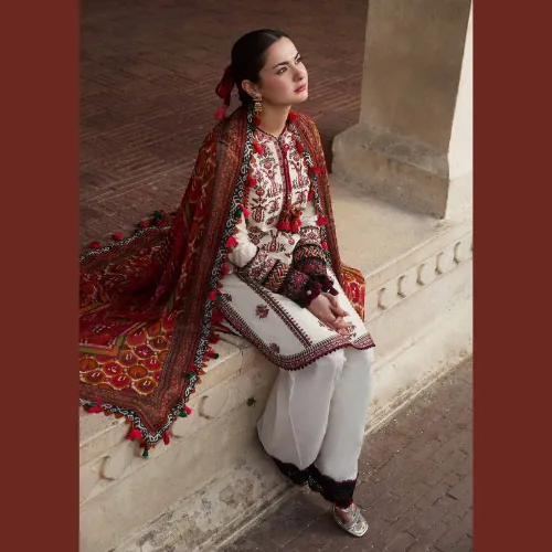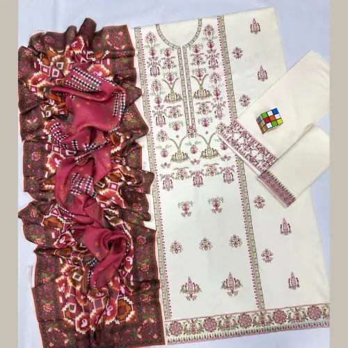 Completing the ensemble is a wool printed shawl that provides both warmth and a touch of contemporary style. This suit is perfect for winter festive gatherings, family occasions, and formal events, offering a luxurious yet practical outfit option. With its premium fabric and intricate detailing, it ensures both elegance and comfort throughout the season.