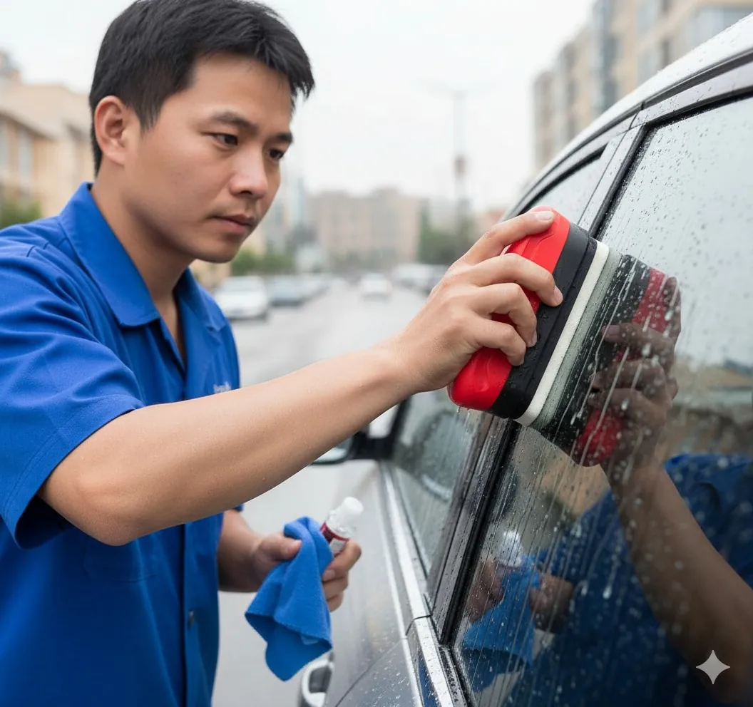 The kit features a high-density, abrasive cleaning sponge/brush attached to a clever integrated handle/container. This container can be filled with a cleaning agent (like a glass cleaning fluid or polish) for convenient application directly through the sponge during scrubbing, providing a deep, powerful clean. The result is a streak-free, high-shine finish that not only looks great but also significantly improves glare reduction and wiper performance. It's the essential tool for maintaining crystal-clear front and rear windshields and side windows.