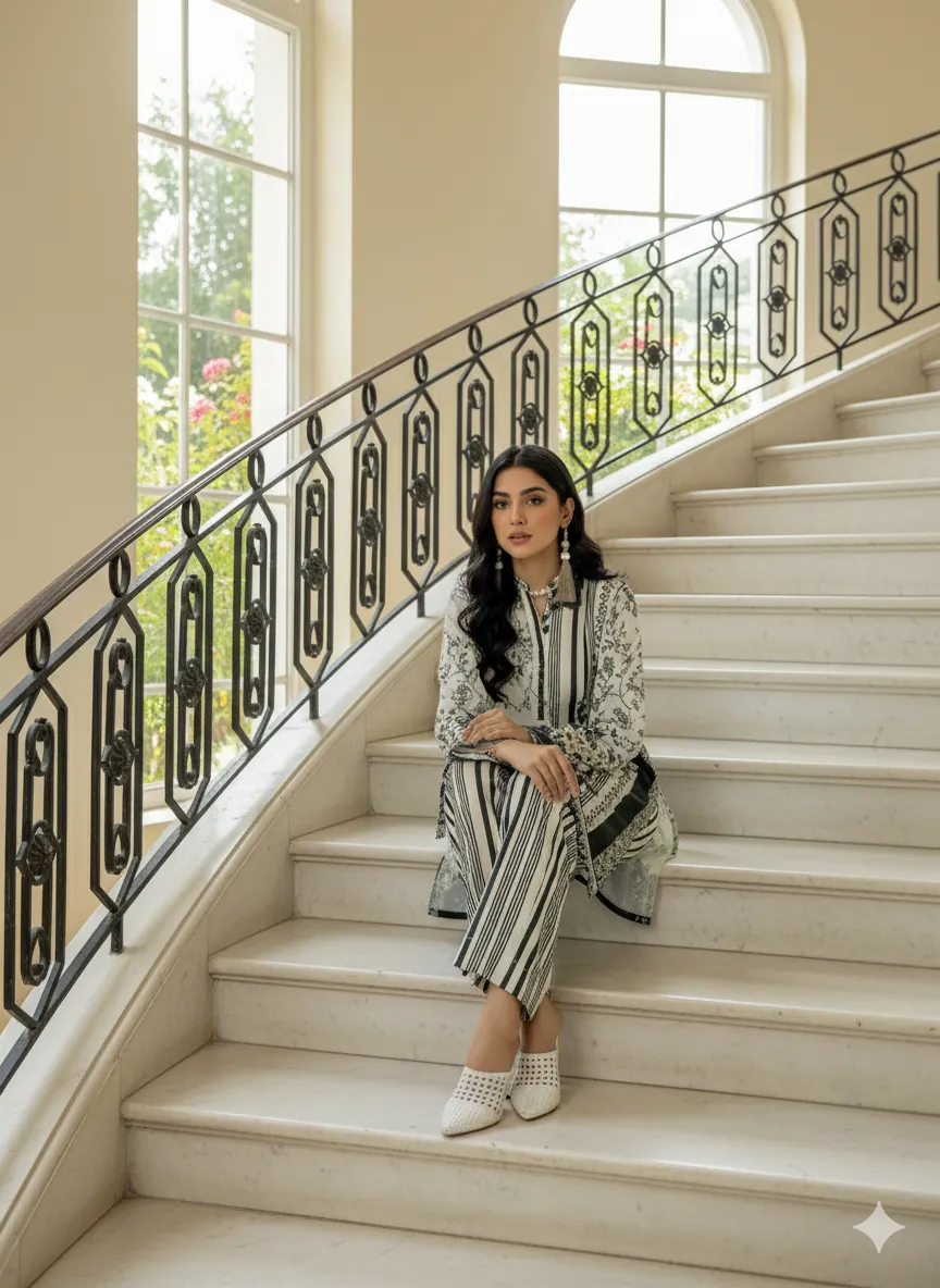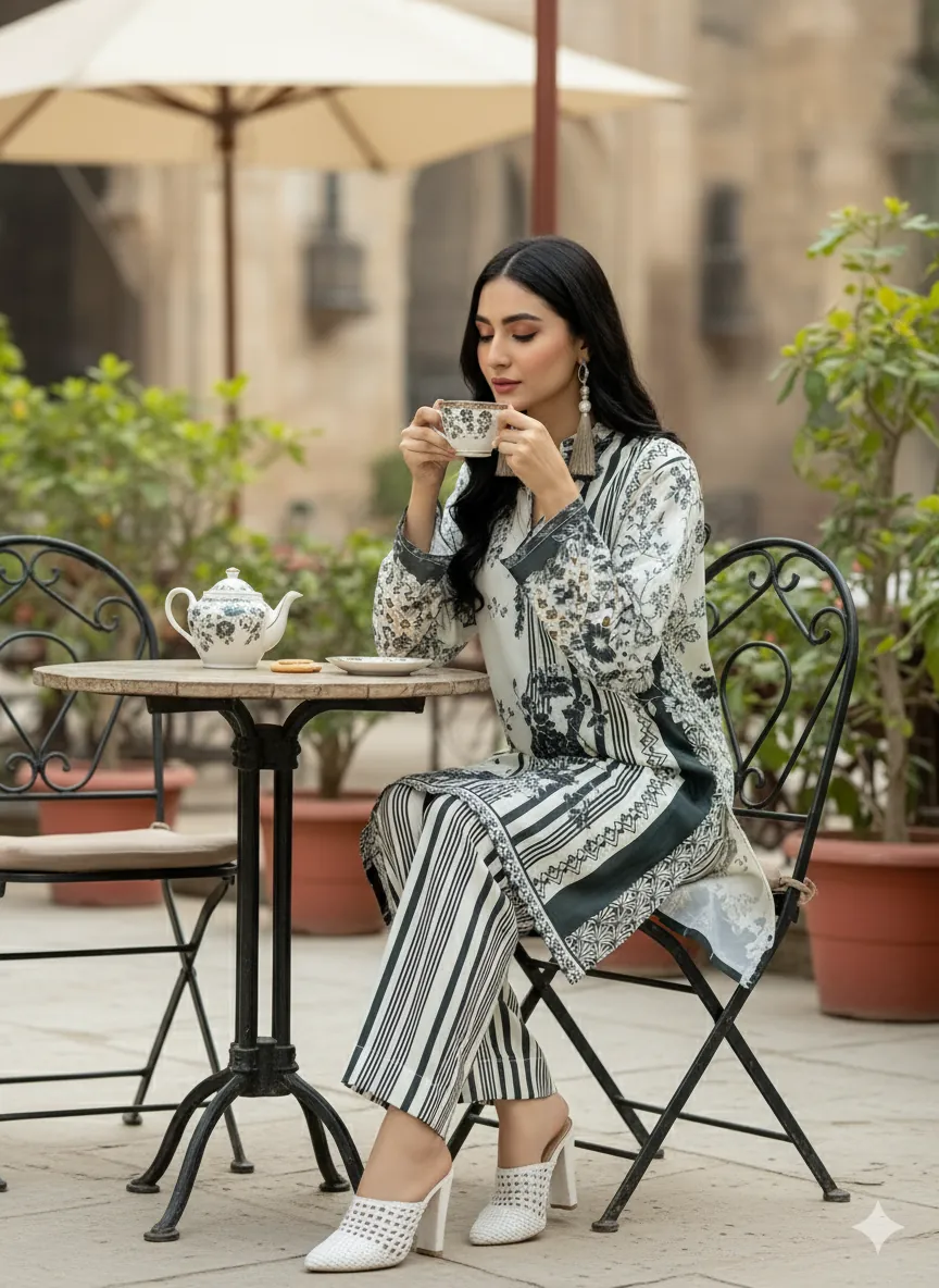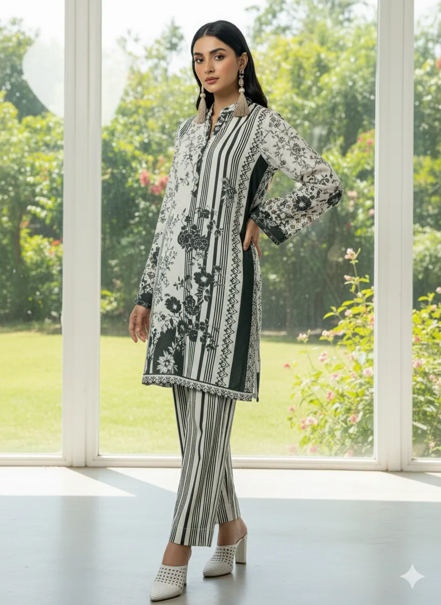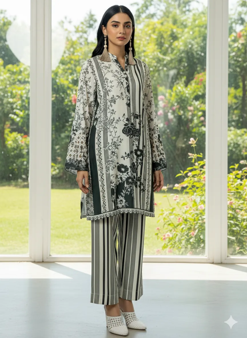 Ready-to-Wear Printed Shirt & Trouser Set | Premium Grip Fabric.Elevate your summer wardrobe with this exquisite, ready-to-wear 2-piece printed suit, a standout piece from our new summer collection. This sophisticated ensemble features a beautifully printed shirt and complementing trousers, both meticulously crafted from high-quality, breathable premium grip fabric. The shirt showcases a stunning, intricate print that seamlessly blends modern and classic motifs, while the trousers feature a bold, coordinated pattern that creates a cohesive and visually striking look. The straight-cut shirt provides a graceful and flattering silhouette, while the comfortable trousers ensure ease of movement, making this outfit as practical as it is stylish. Perfect for a wide range of occasions, from a chic brunch with friends to a sophisticated evening gathering, this ensemble is a testament to effortless elegance and contemporary design.