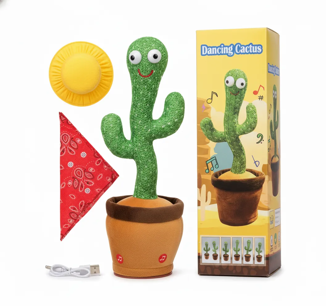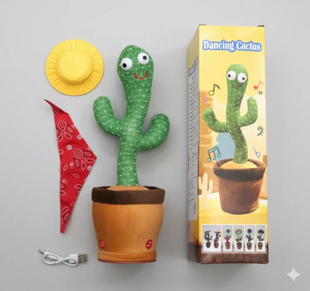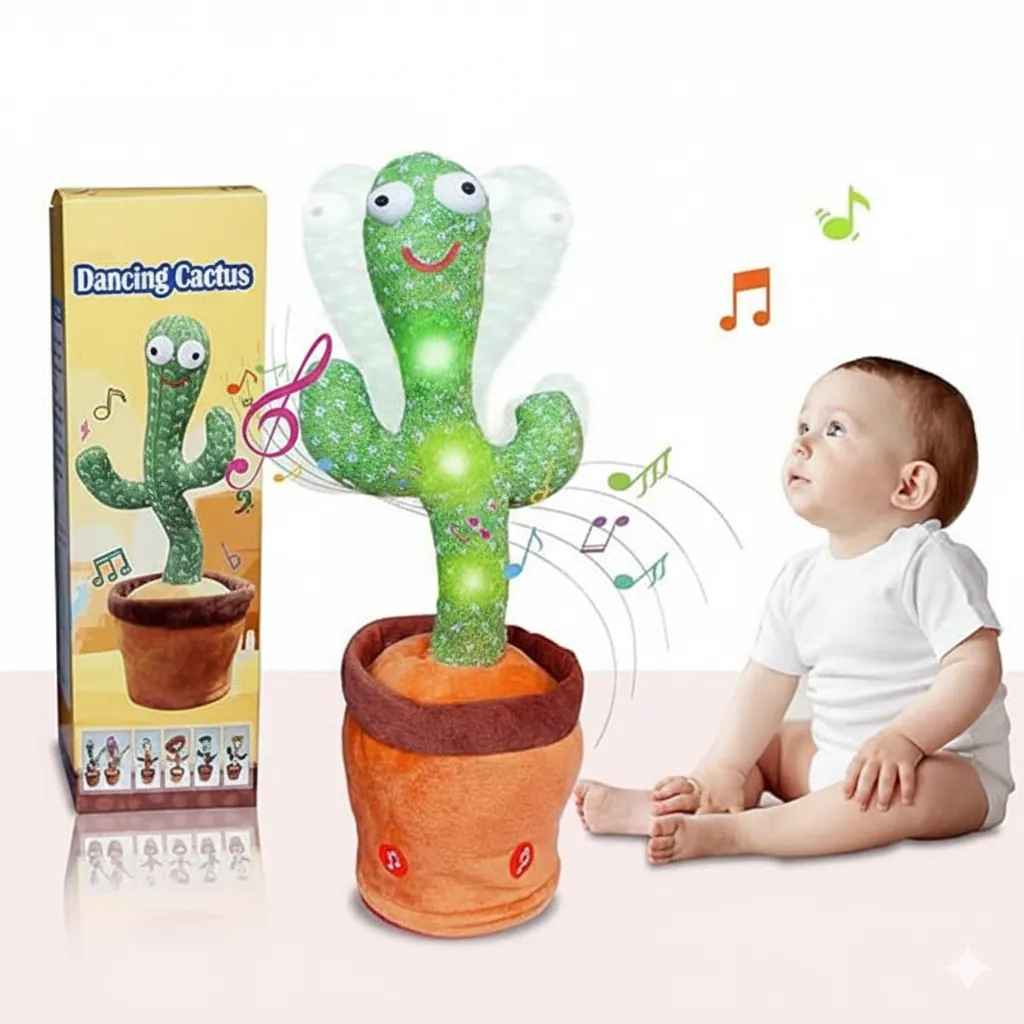 Bring joy and laughter home with the Rechargeable Dancing & Talking Cactus! This cute plush toy can dance, talk, mimic voices, sing songs, and light up while moving rhythmically to the music. It comes with a built-in rechargeable battery, so no need to buy extra cells. The cactus wears a soft muffler and cap, giving it a fun and cozy look. Made from high-quality plush fabric, it’s safe for kids and a great choice for gifts, parties, or room decoration. Enjoy endless entertainment as it repeats your words and dances to the beat!