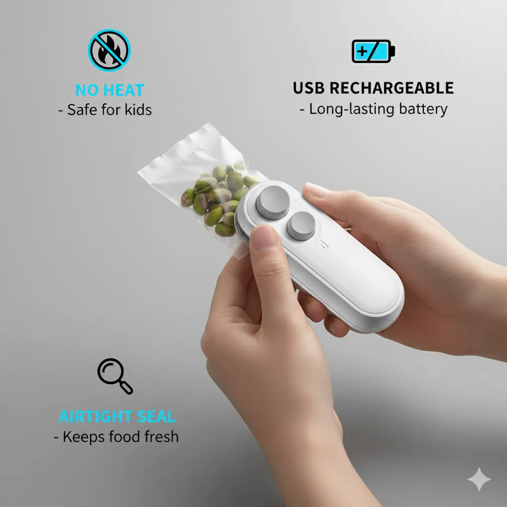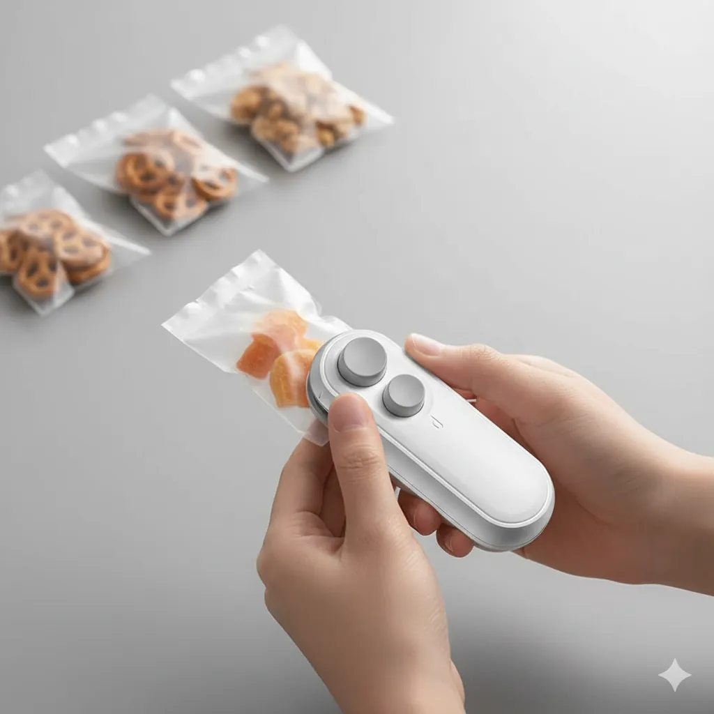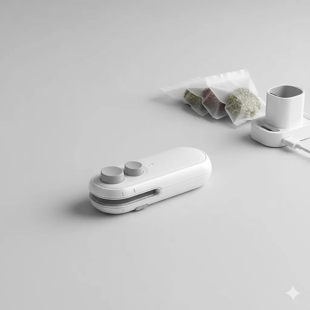 The Modern Mini Bag Sealer is the ultimate kitchen tool for organization and food preservation. Featuring a sleek, minimalist aesthetic, this rechargeable handheld device effortlessly creates an airtight, watertight seal on a variety of plastic and aluminum foil bags. Say goodbye to stale chips and leaky freezer bags—this sealer instantly locks in freshness and prevents spills, helping you significantly reduce food waste.This advanced mini sealer not only streamlines your kitchen but also makes the product eco-friendly compared to battery-operated alternatives. Its ergonomic design makes sealing bags simple, whether you're at home, camping outdoors, or preparing food for travel. The integrated hidden cutter on the opposite end adds 2-in-1 functionality, allowing you to easily open packages as well.