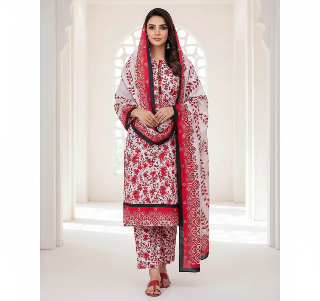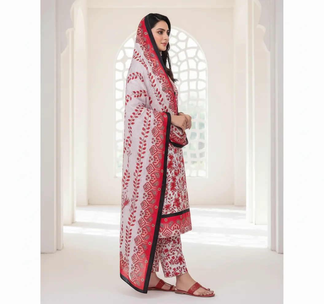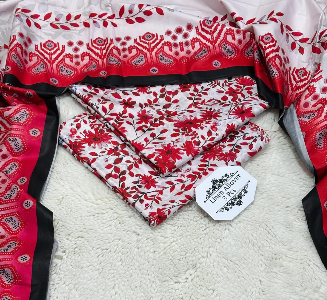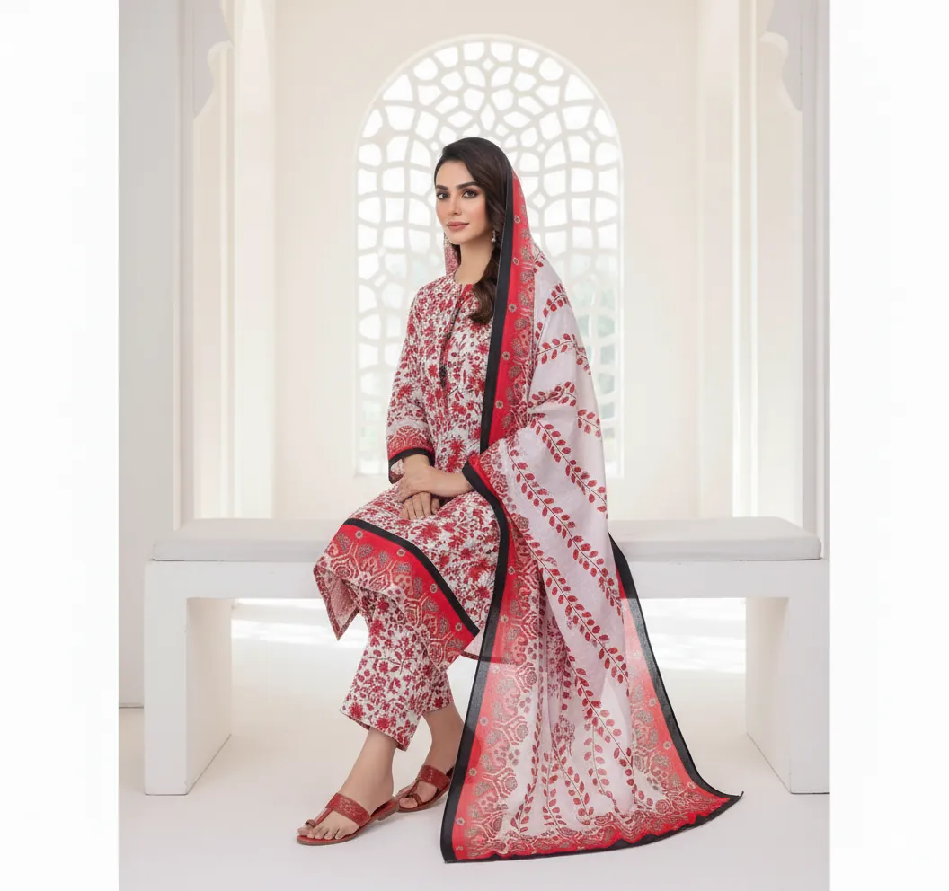 Red & White Floral Printed Linen 3-Piece Suit for Women – Elegant Allover Design | Shirt, Trouser & Dupatta | Premium Fabric | Bonanza Inspired | Single & Bulk Set (25 Pcs)