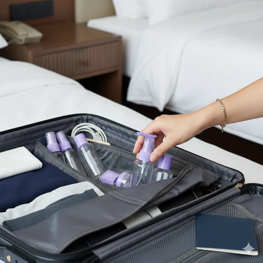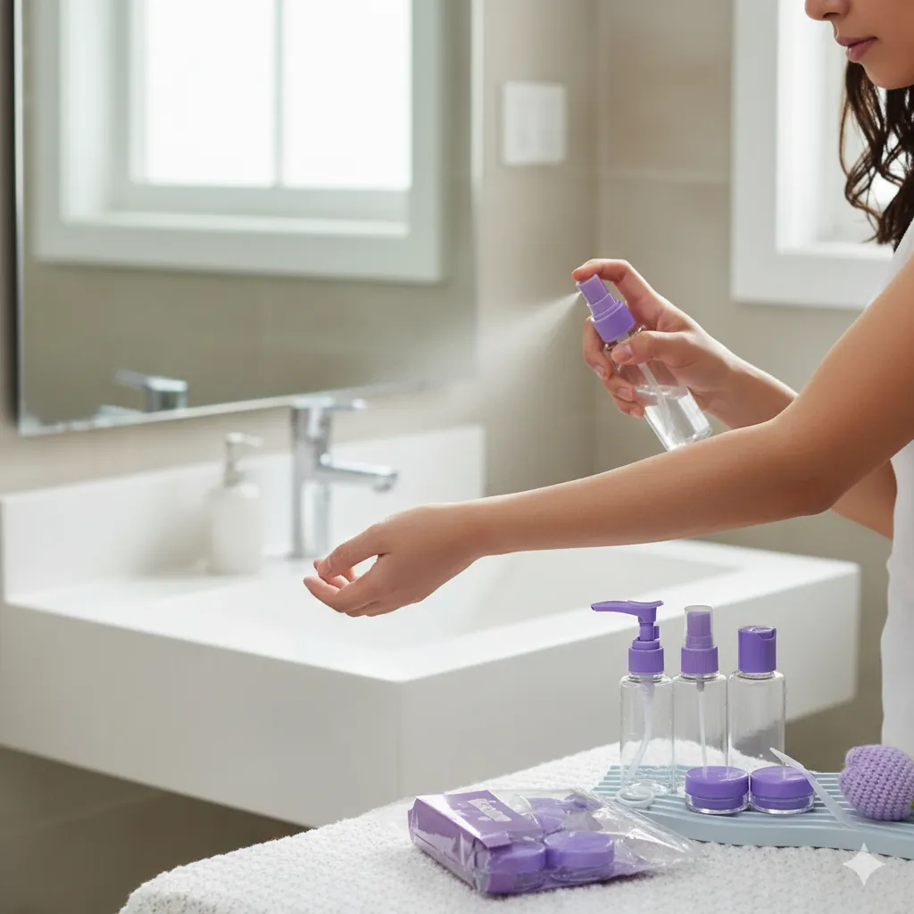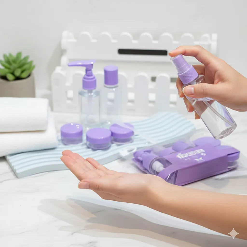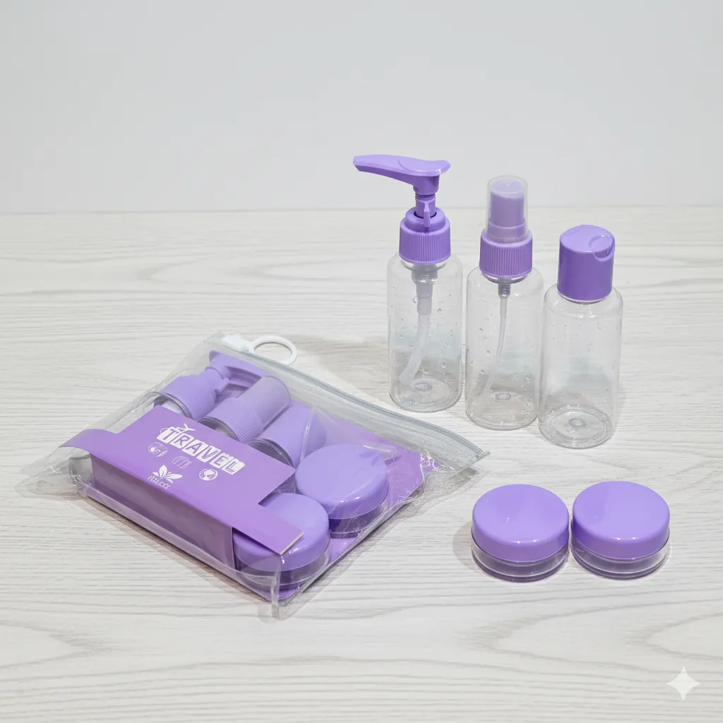 Refillable Travel Bottle and Jar Set (6-Piece) | TSA Approved Cosmetic Containers with Pump, Spray, & Cream Jars .Never overpack heavy bottles again! This compact and convenient 6-piece travel kit is your essential solution for keeping your favorite cosmetics and toiletries with you on the go. Designed with clear, durable plastic bottles and charming purple accessories, this set ensures you meet travel restrictions while staying perfectly organized.