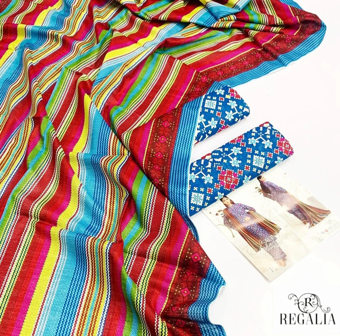 The centerpiece of this attire is its digitally printed Khaddar dupatta. Showcasing an amazing design with bold, contrasting stripes in rich red, yellow, and blue, it elevates the entire outfit from simple to stunning.