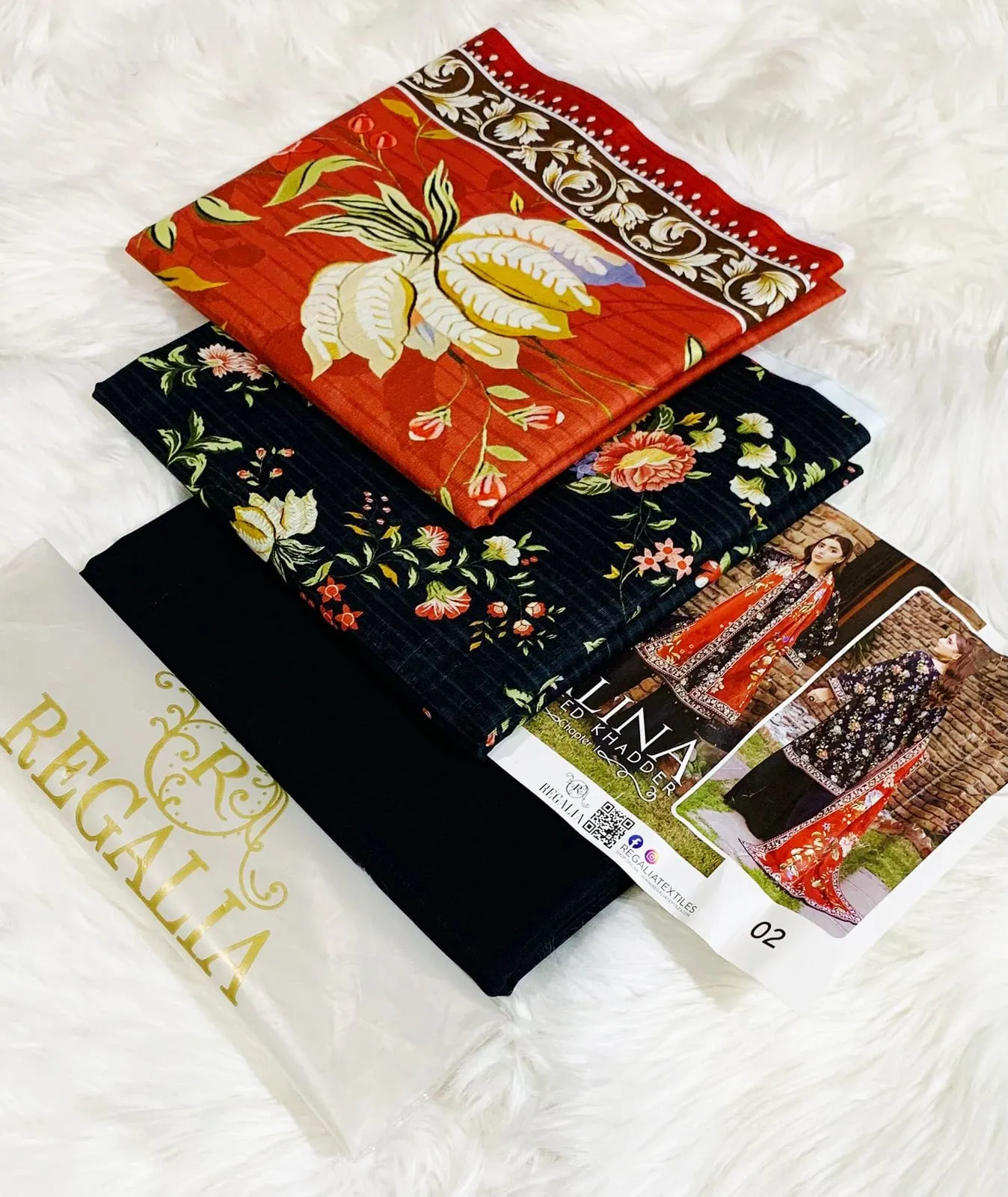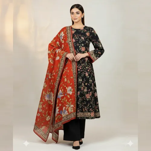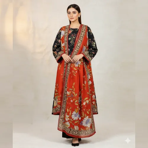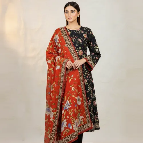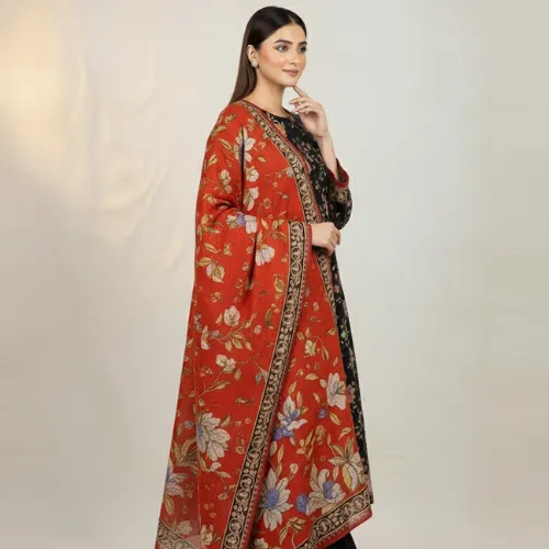 Regalia 3pc Black Khaddar Suit with Floral Print & Vibrant Rust Red Shawl | Winter Frock Style Introduce sophisticated style to your winter wardrobe with this stunning 3pc Black Khaddar Suit. The Black Shirt (Frock Style) features an elegant Allover Digital Floral Print in multi-colors, maintaining a decent yet beautiful aesthetic. This classic black base is dramatically paired with a Vibrant Rust Red Digital Printed Khaddar Dupatta (Shawl) that showcases rich floral and border designs, adding a luxurious layer of warmth and color. The accompanying Black Trouser completes this cohesive ensemble.