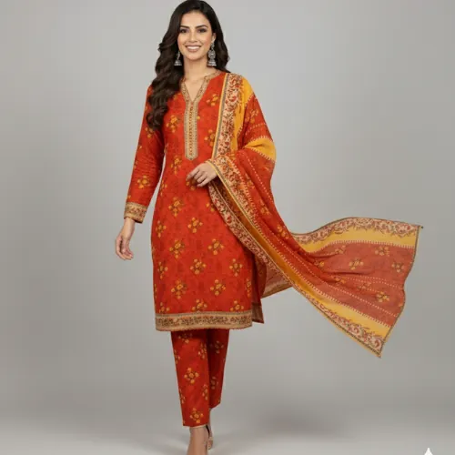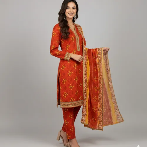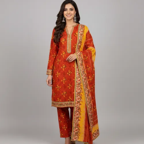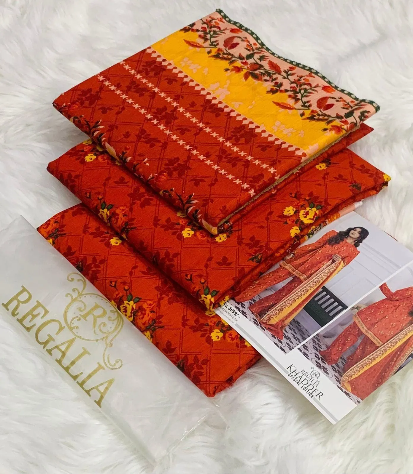 Regalia Festive Rust & Yellow Floral Khaddar Suit | 3-Piece Unstitched Autumn Collection with Designer Dupatta. Embrace the golden hues of the autumn season with this exquisite creation from Regalia. The beautiful combination of earthy rust and sunny yellow makes this suit a perfect celebration of fall, designed to bring warmth and elegance to your wardrobe.