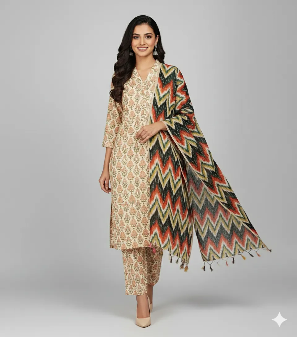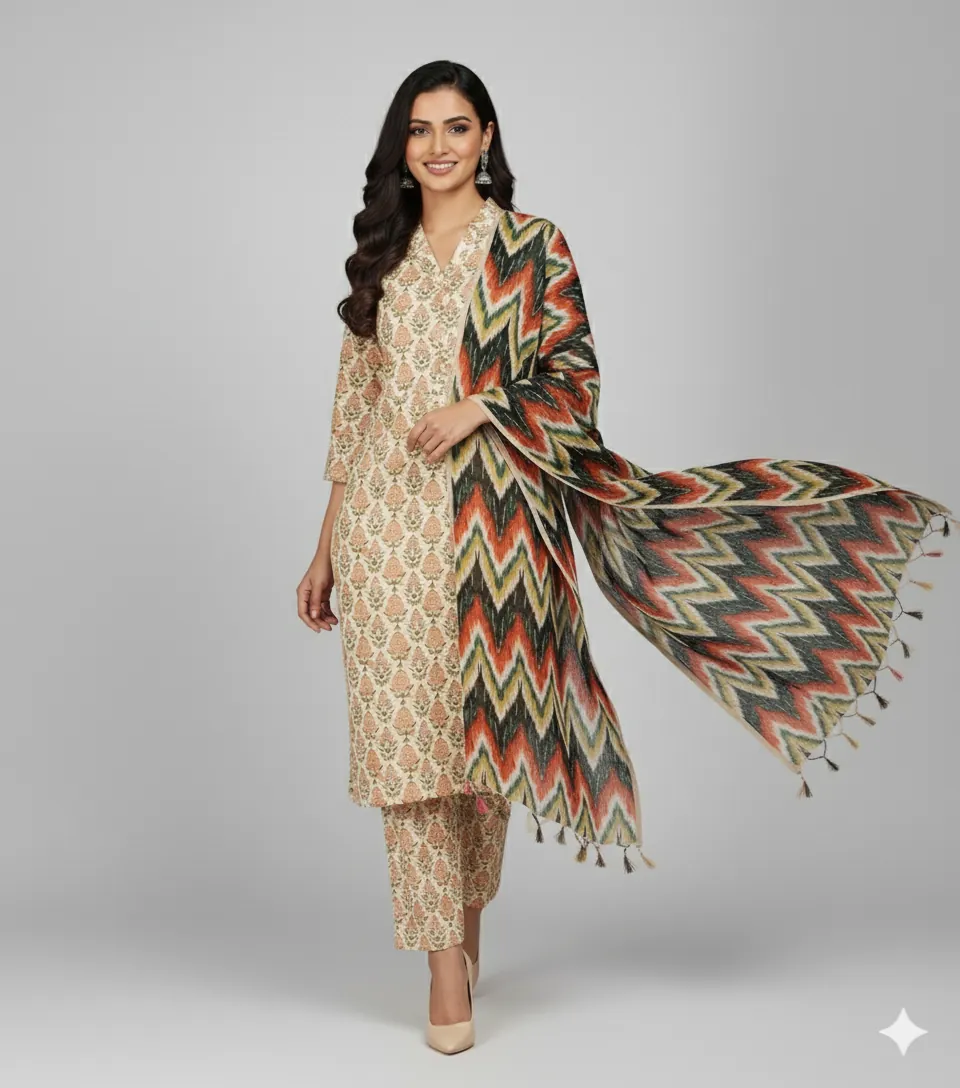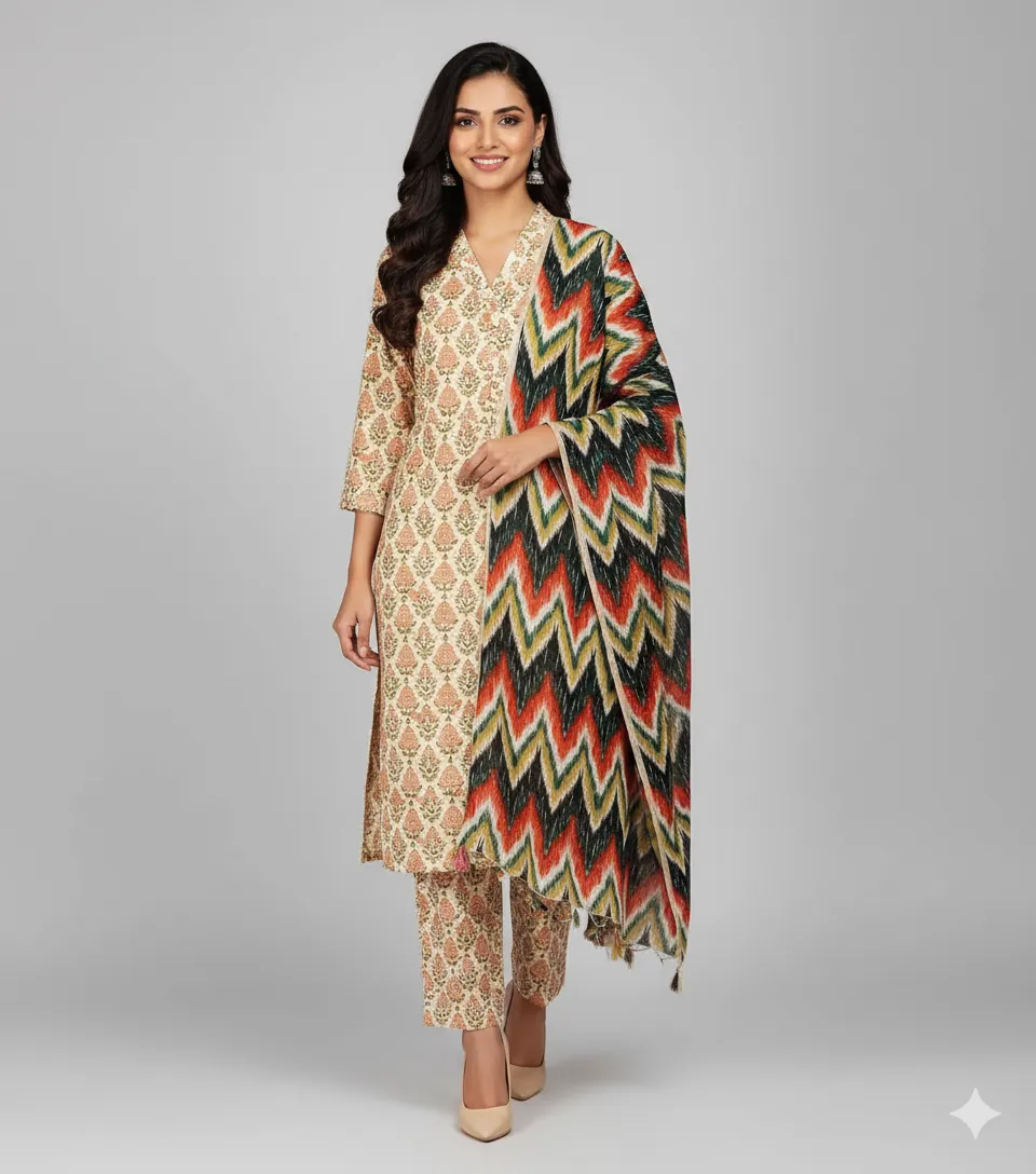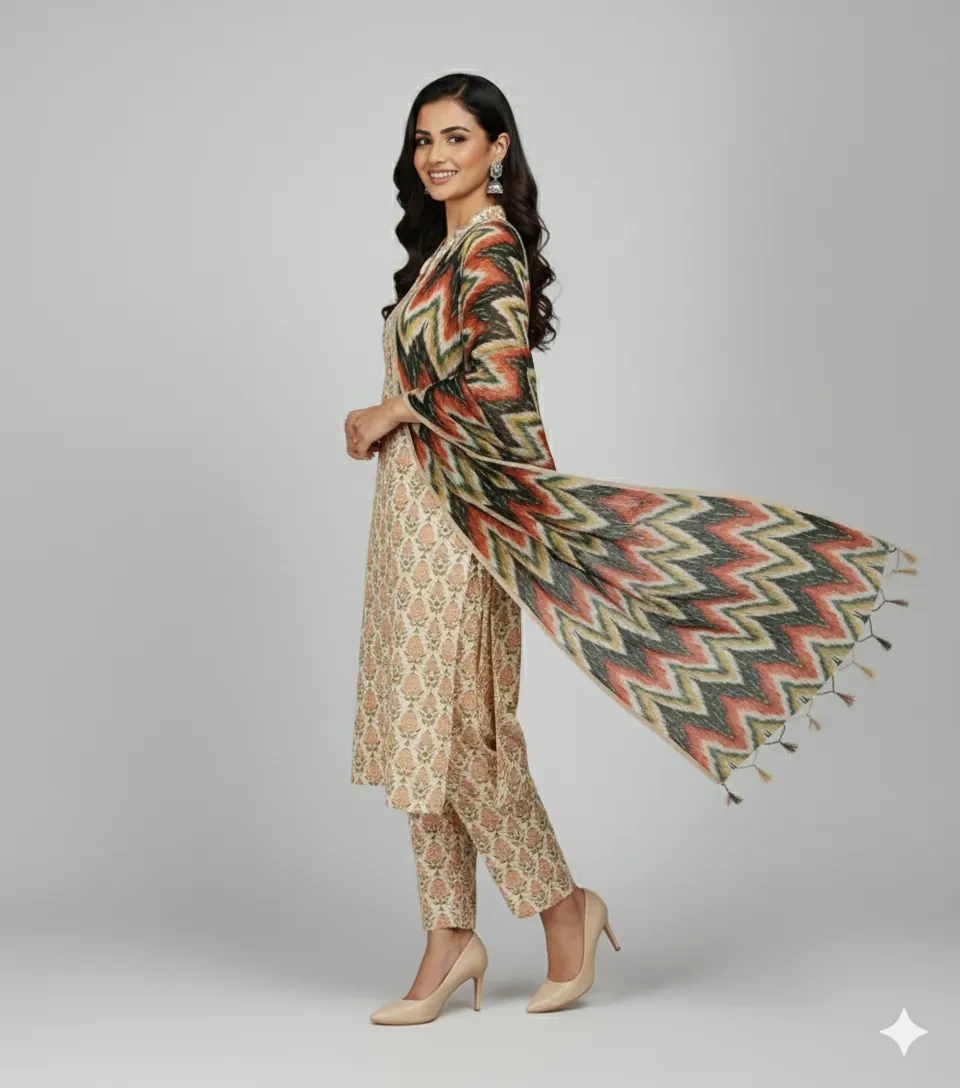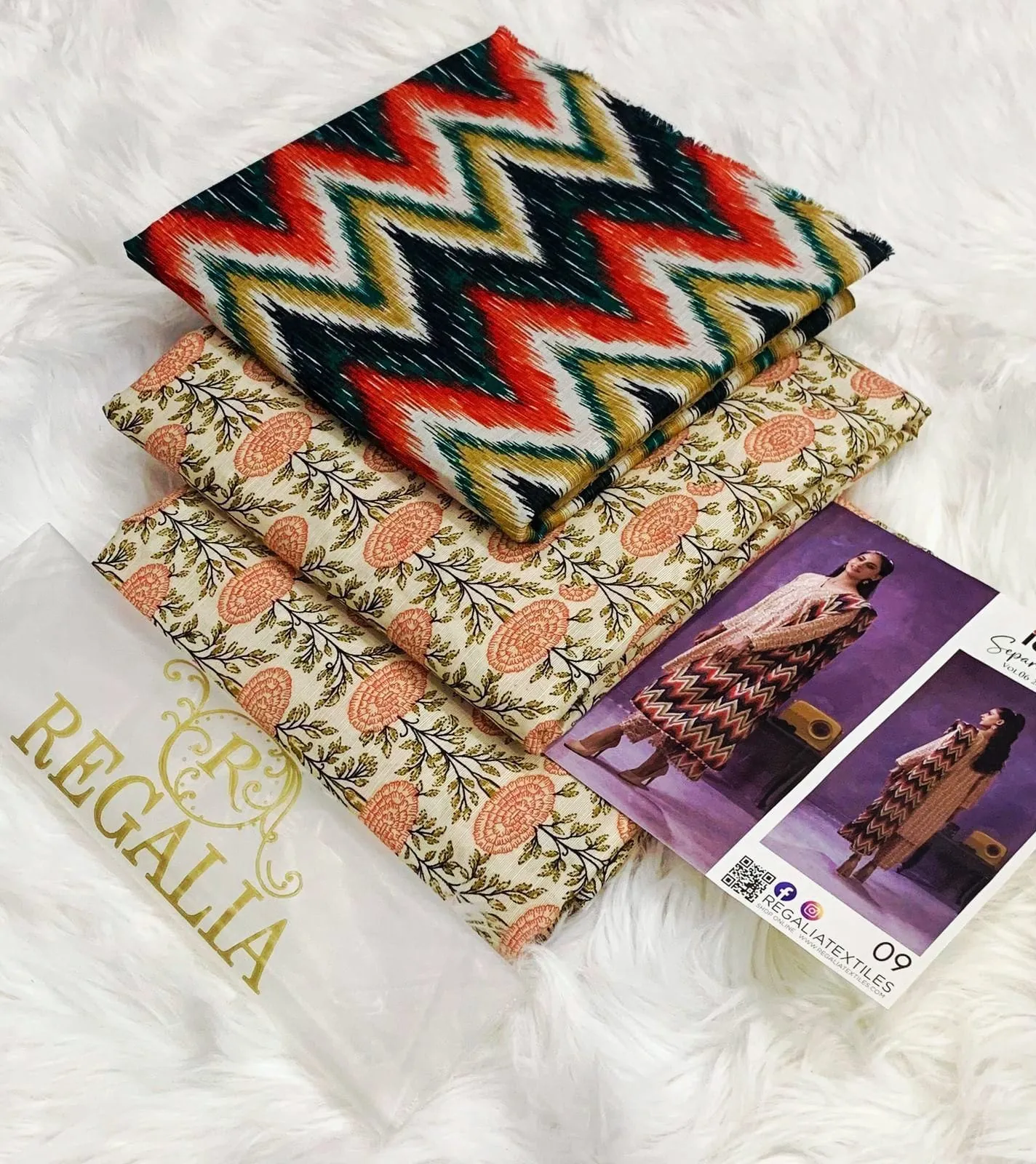 Regalia Modern Cream Khaddar Suit | Unstitched 3-Piece with Multi-Color Chevron Print Dupatta redefine your style with this unique fusion ensemble from Regalia's Winter 2025 collection. Crafted from premium Khaddar fabric, it's the perfect weight to keep you comfortable through the upcoming mild winter.