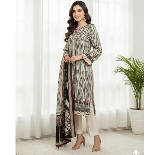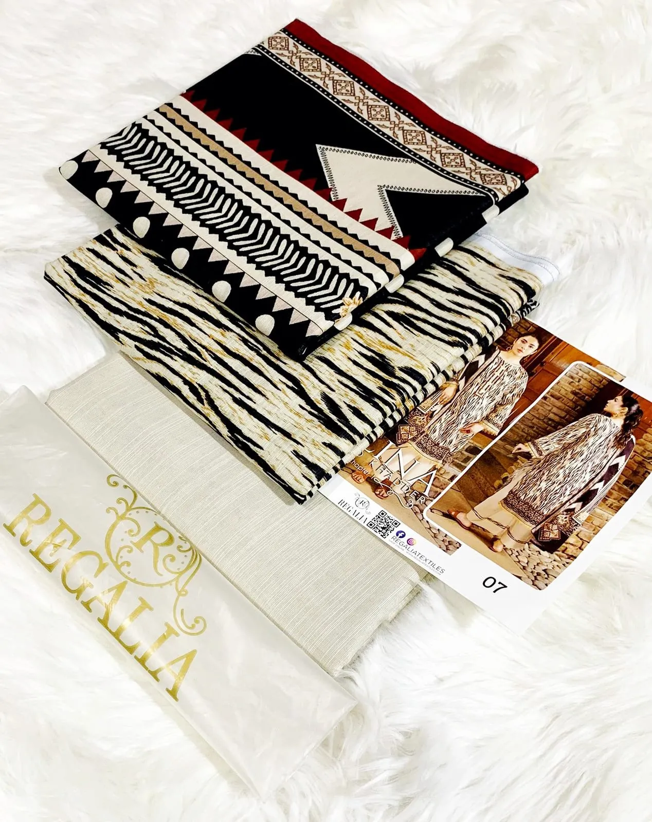 Regalia Monochrome Abstract Print Linen Suit | 3-Piece Unstitched Fall/Winter Collection for Women. For the woman who walks the line between art and fashion, Regalia presents this breathtaking monochrome ensemble. It is the perfect outfit to transition your wardrobe from summer to the cooler, pleasant days of autumn in Faisalabad. Crafted from a premium, breathable fabric like linen or lightweight khaddar, it offers exceptional comfort and an elegant drape, making it suitable for all-day wear.