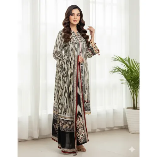 The true masterpiece is the dupatta, which combines multiple bold patterns. A striking zebra-like print transitions into a dramatic black chevron, finishing with a richly detailed geometric pattern on the pallu, all tied together with elegant red borders. The suit comes with a plain, off-white trouser fabric, allowing the intricate prints of the shirt and dupatta to take center stage. As an unstitched set, you can tailor it to a perfect fit, creating a look that is uniquely yours for semi-formal events, art gallery visits, or sophisticated luncheons.