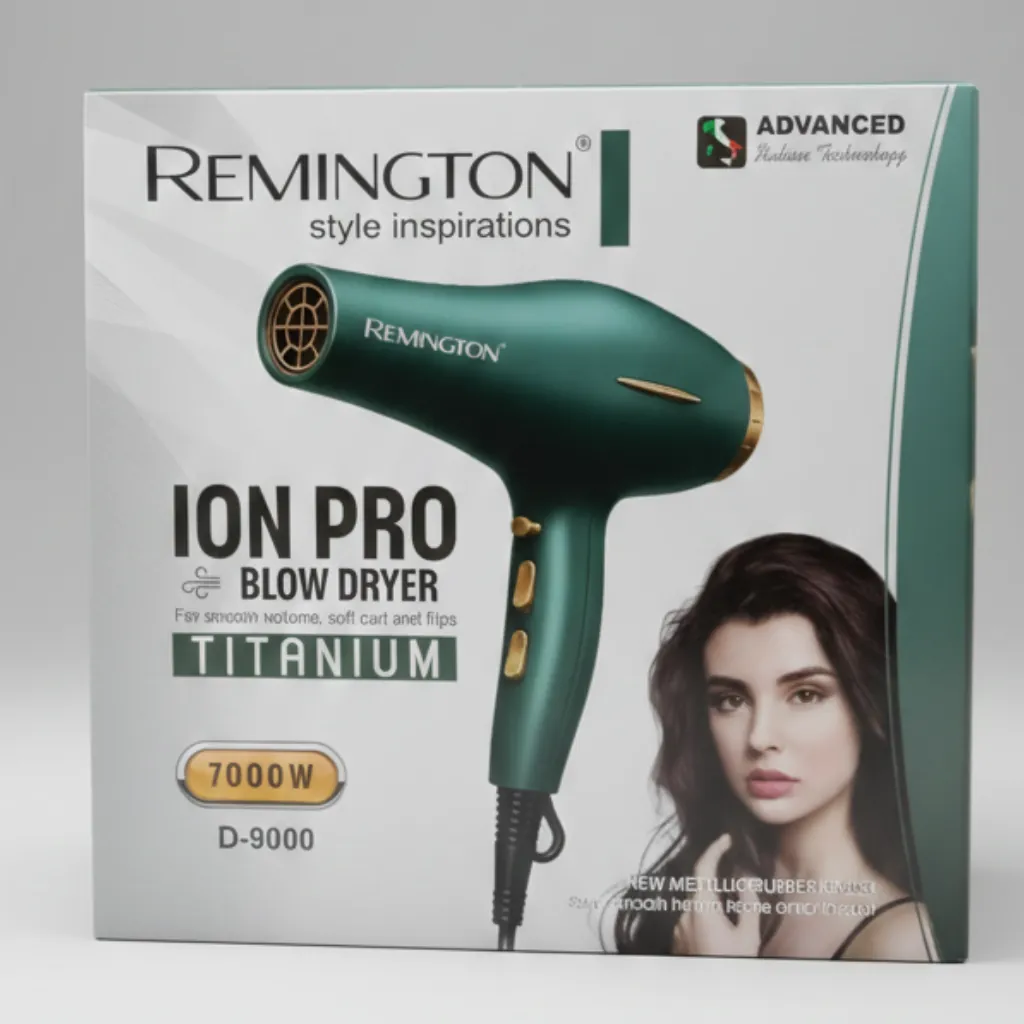 The REMINGTON Style Inspirations ION PRO Blow Dryer Titanium 7000W (Model D-9000) is designed for powerful, fast, and professional hair drying results. With its high-performance 7000W motor, this blow dryer delivers strong airflow that significantly reduces drying time while protecting hair from excessive heat damage.