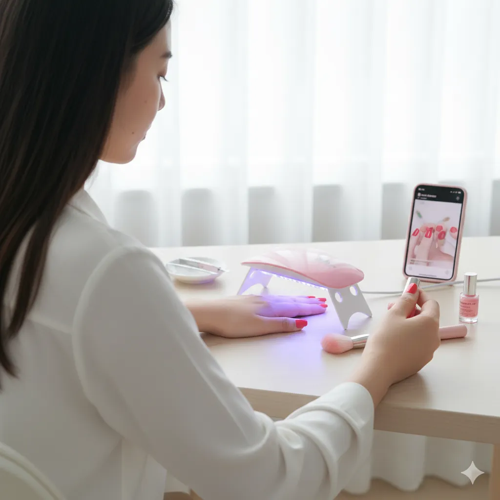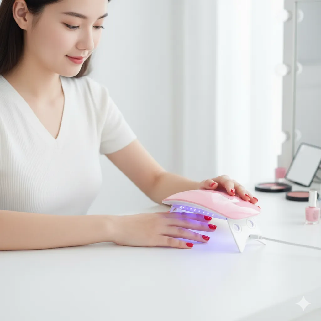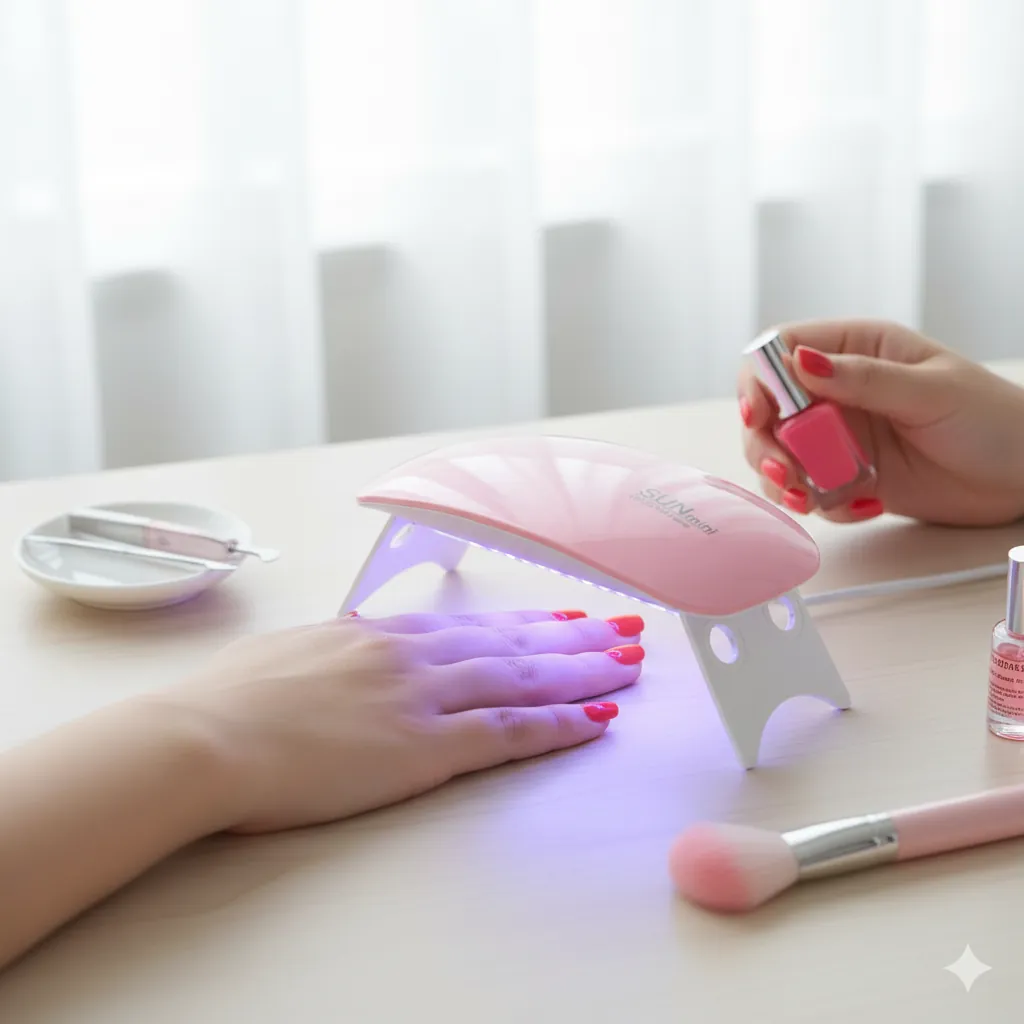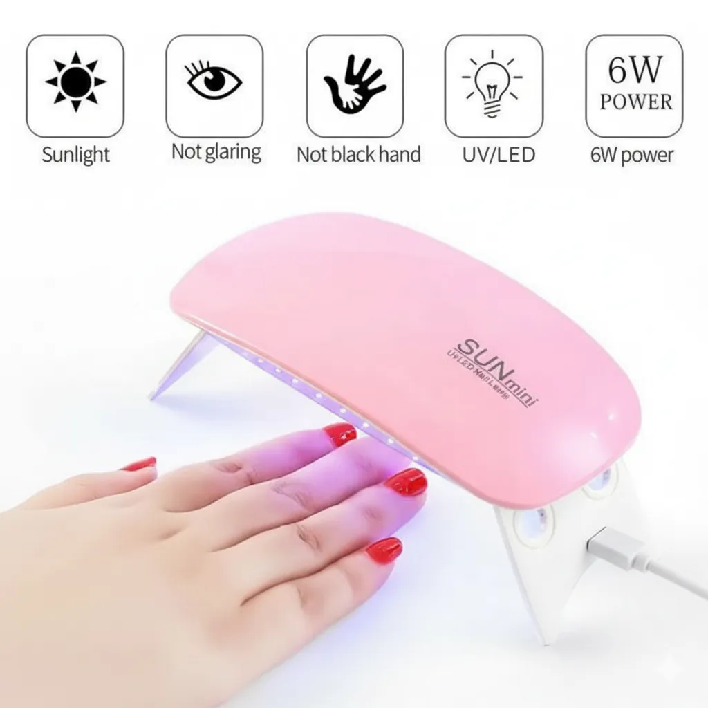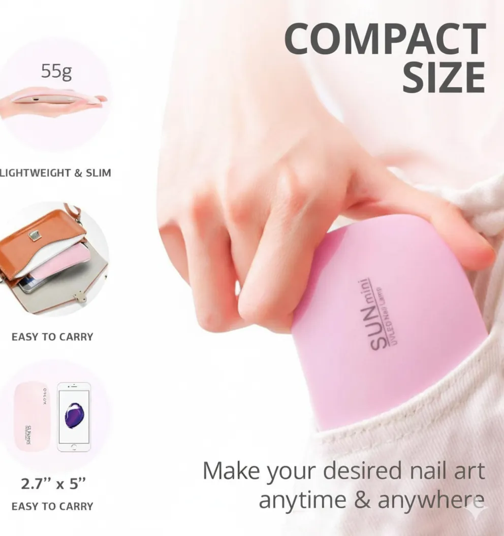 Revolutionize Your Manicure Routine with the Mini UV LED Nail Lamp.This small and easy-to-carry UV LED nail lamp is perfect for everyone who wants beautiful gel nails without any fuss. It's so light, you can put it in your pocket or bag and take it anywhere you go. No more worrying about your nails getting messed up!This little lamp works great and cures all kinds of gel polish quickly. Just put your hand under the lamp, and in a few minutes, your nails will be dry, shiny, and ready to go.You can power it with any USB port, like the one on your computer or a power bank. This means you can do your nails at home, at a friend's house, or even on a trip. It has a stand that you can fold out, so it's easy to use and store. The light is soft and safe for your eyes and skin, so your hands won't get dark.This mini lamp gives you the freedom to do your own perfect nails whenever and wherever you want. It's a simple tool that makes getting great-looking nails super easy.