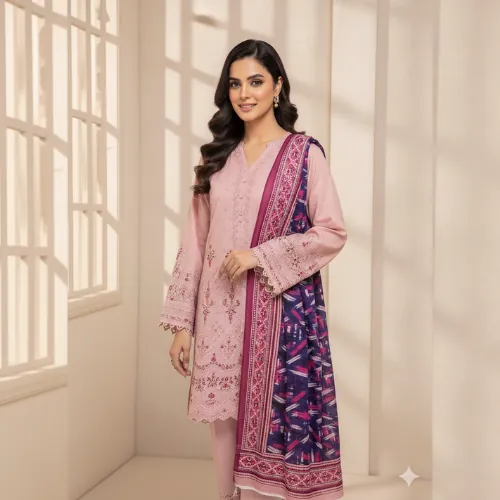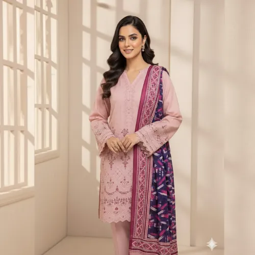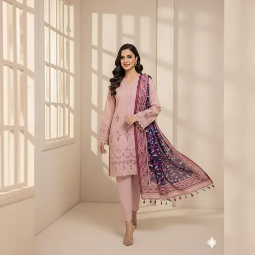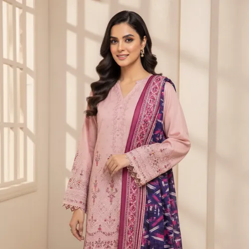 Completing this graceful ensemble are the solid dyed trousers in matching dusty pink, made from high-quality airjet Khaddar for a flawless drape. This unstitched set offers you the wonderful opportunity to customize the tailoring for a fit that is both perfect and personal.