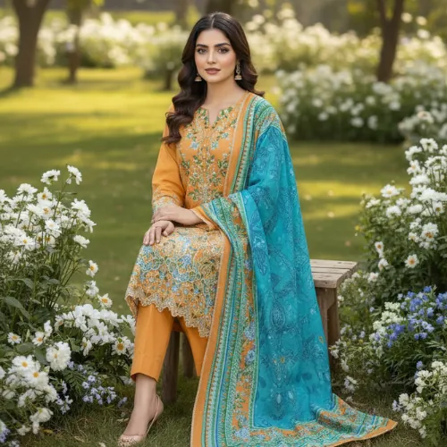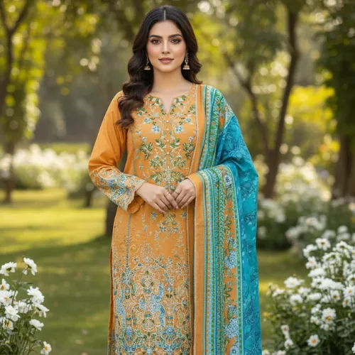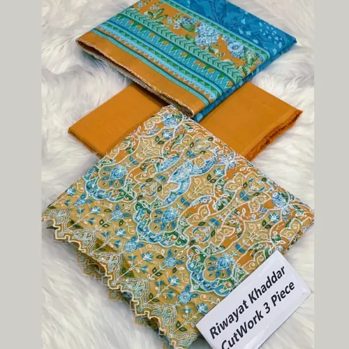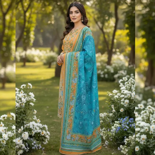 Riwayat Mustard Embroidered Khaddar Suit with Turquoise Dupatta | 3-Piece Unstitched Winter Collection. Embrace the beauty of the season with this masterpiece from the Riwayat π Collection. Expertly crafted from the finest quality pure Khaddar, this suit is designed to offer unparalleled warmth, comfort, and style throughout the autumn and winter months.