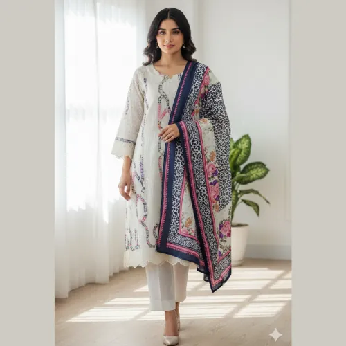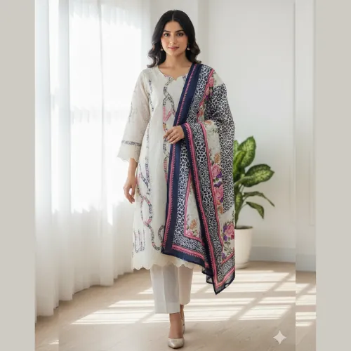 Included is a pair of solid off-white trousers, made from premium airjet Khaddar, providing a calm and clean finish that allows the detailed shirt and vibrant dupatta to shine. Being unstitched, this suit offers the ultimate freedom to customize the fit and style to your personal taste, creating an outfit that is uniquely yours.