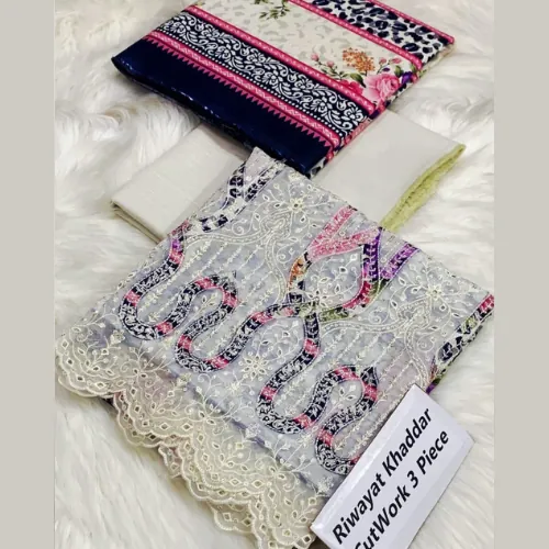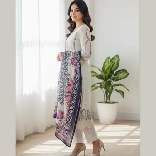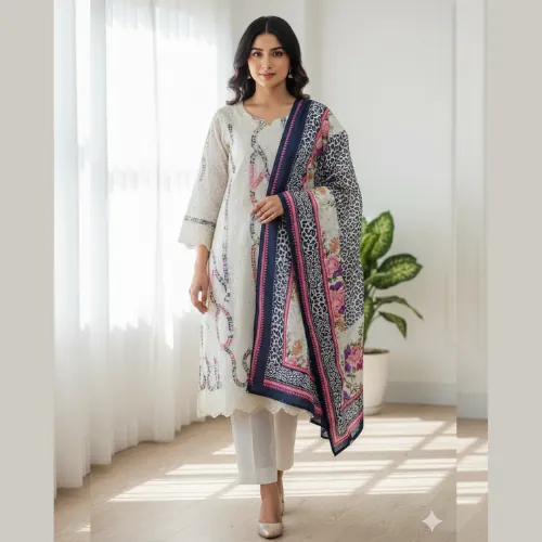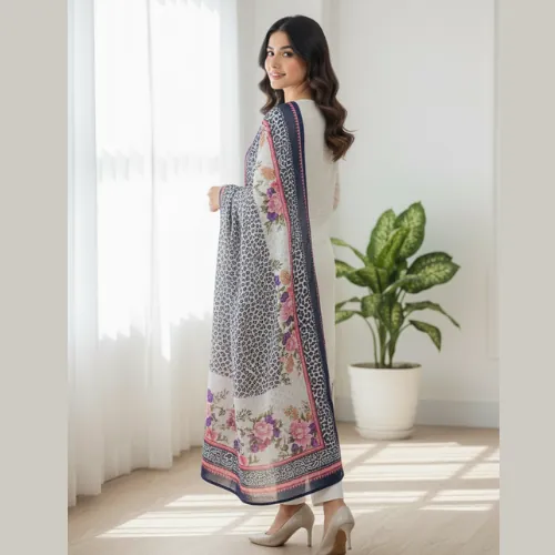 Riwayat Off-White Embroidered Khaddar Suit with Floral & Leopard Print Dupatta | 3-Piece Unstitched Collection. Step into the spotlight with a design that perfectly balances classic grace with contemporary trends. This latest creation from the Riwayat 🍂 Collection is crafted from luxurious, pure Khaddar, ensuring you stay warm and stylish throughout the cooler seasons.