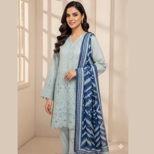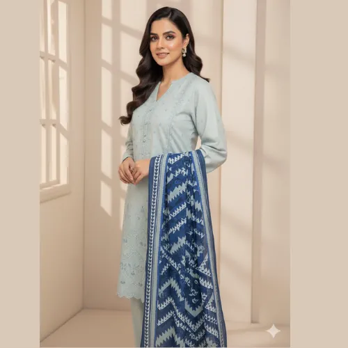 Riwayat Powder Blue Embroidered Khaddar Suit with Royal Blue Dupatta | 3-Piece Unstitched Winter Collection. Step into a world of serene beauty and classic style with this exquisite design from the Riwayat 🍂 Collection. Crafted from the finest pure Khaddar, this suit is the epitome of winter luxury, offering both exceptional warmth and a graceful silhouette.