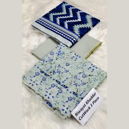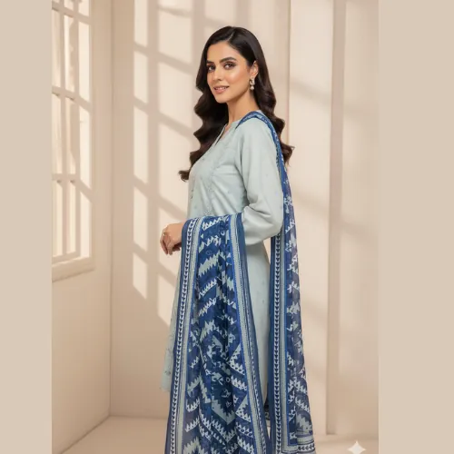 Making a bold and beautiful statement is the premium Khaddar dupatta. In a deep, vibrant royal blue, it features a captivating geometric print that provides a modern contrast to the classic embroidery of the shirt. The rich color and dynamic pattern frame the entire ensemble, adding a layer of contemporary flair.