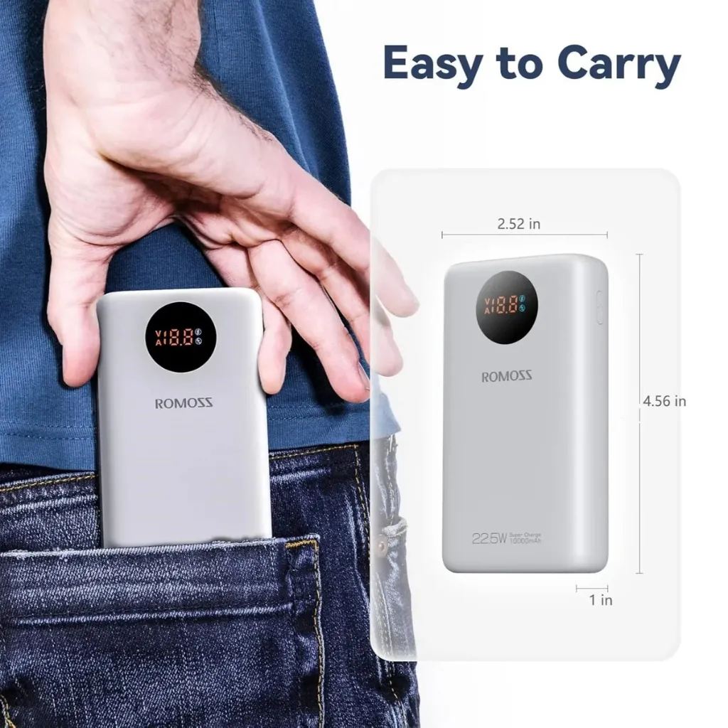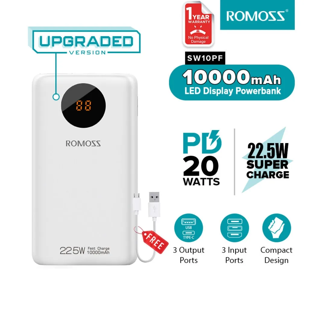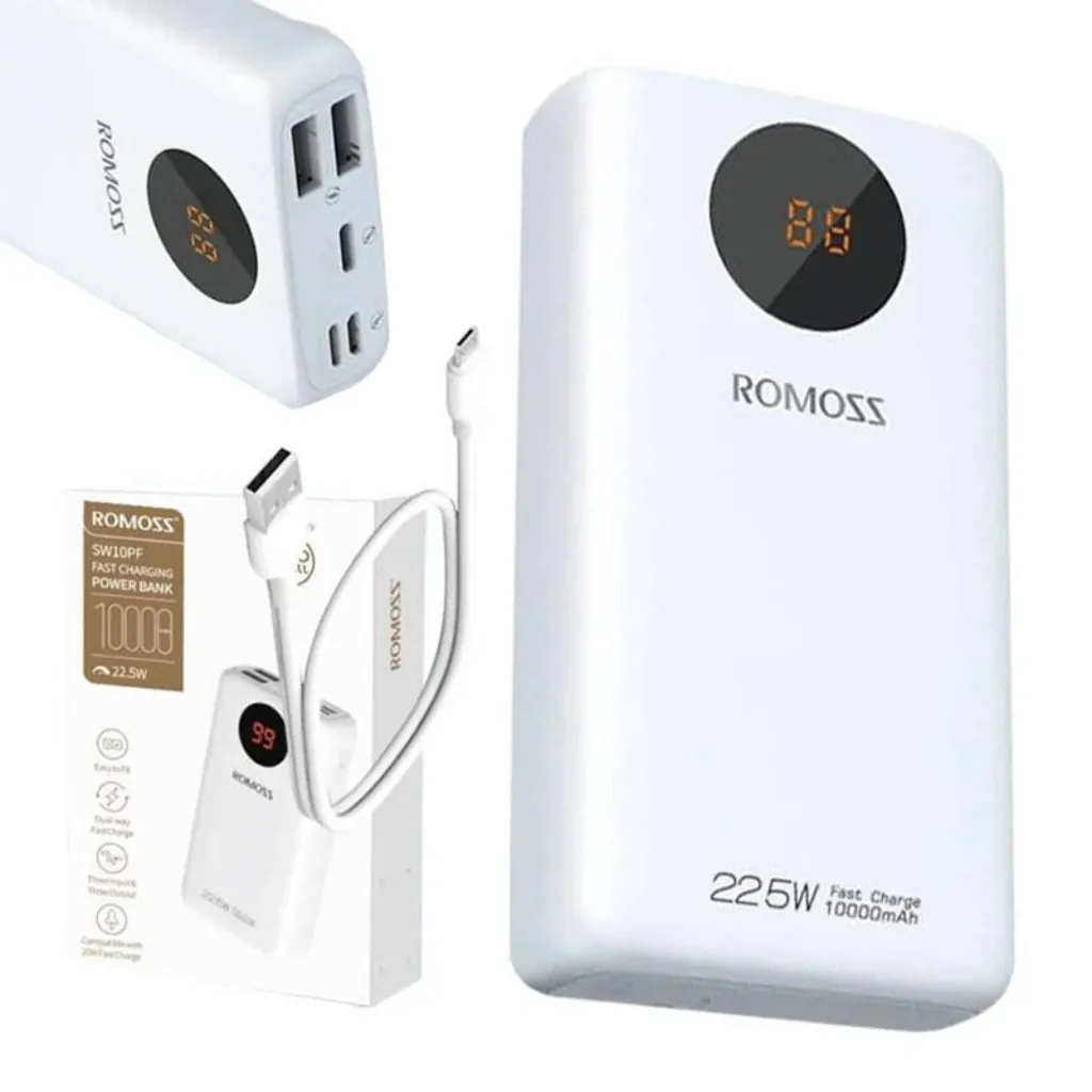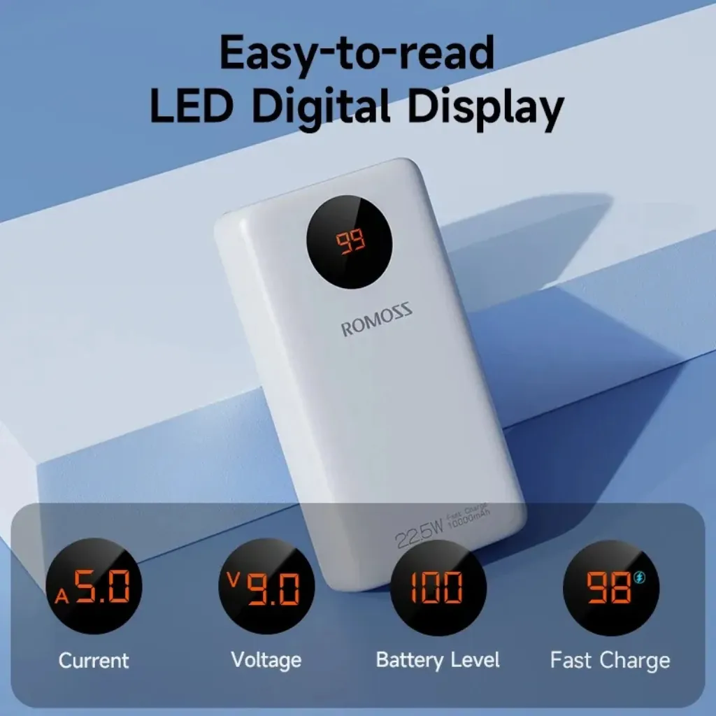 The ROMOSS SW10PF Power Bank is a compact, high-performance portable charger designed to keep your devices fully powered wherever you go. With a 10,000mAh lithium-polymer battery, it delivers multiple full charges for smartphones, tablets, and other USB-powered devices, making it perfect for daily use, travel, and emergency situations. Its 22.5W fast-charging output ensures rapid energy replenishment for compatible devices, minimizing downtime and keeping your gadgets operational. The built-in digital LED display clearly shows the remaining battery percentage, allowing you to monitor your power levels at a glance for better planning.