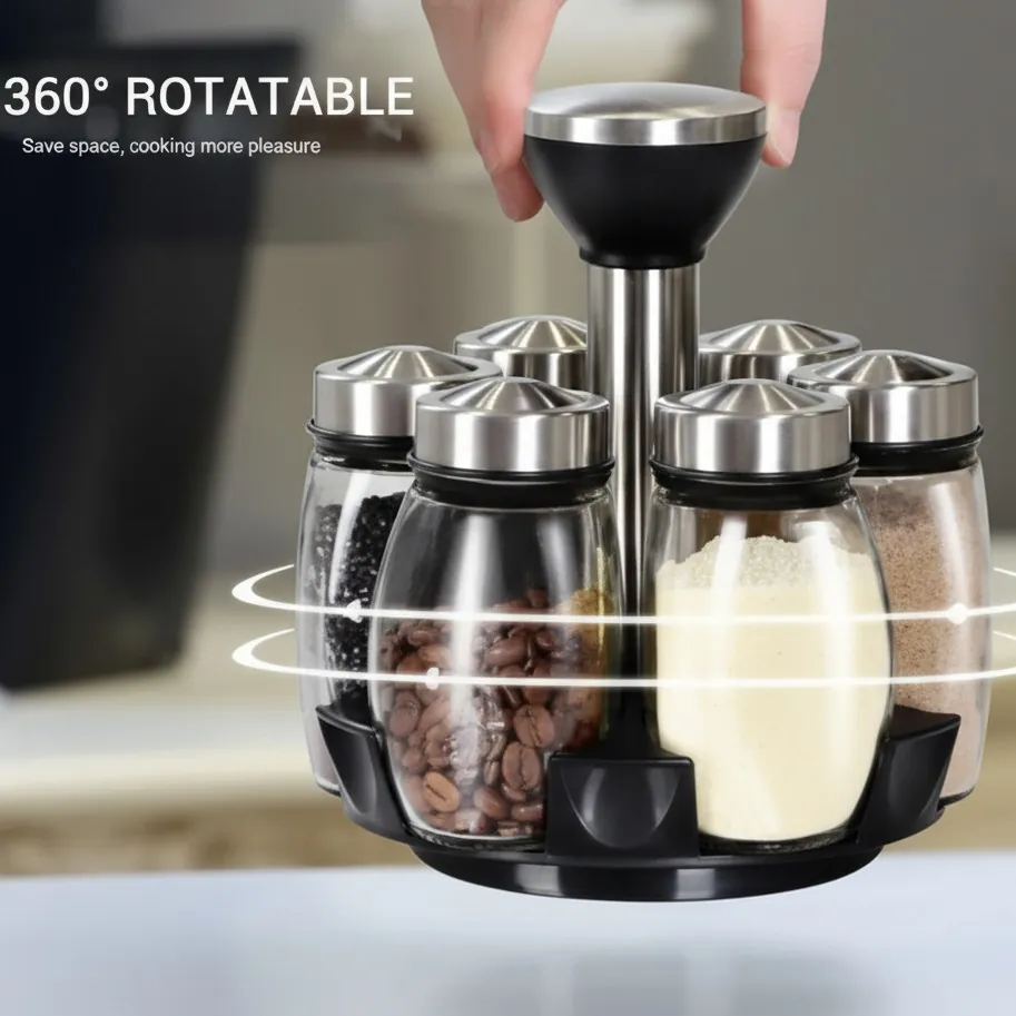 Rotating Spice Rack Organizer with 6 Glass Jars | Countertop Seasoning Dispenser | ABAS TECEDOR DE ESPECIA SET | Kitchen Storage Solution for Herbs & Spices