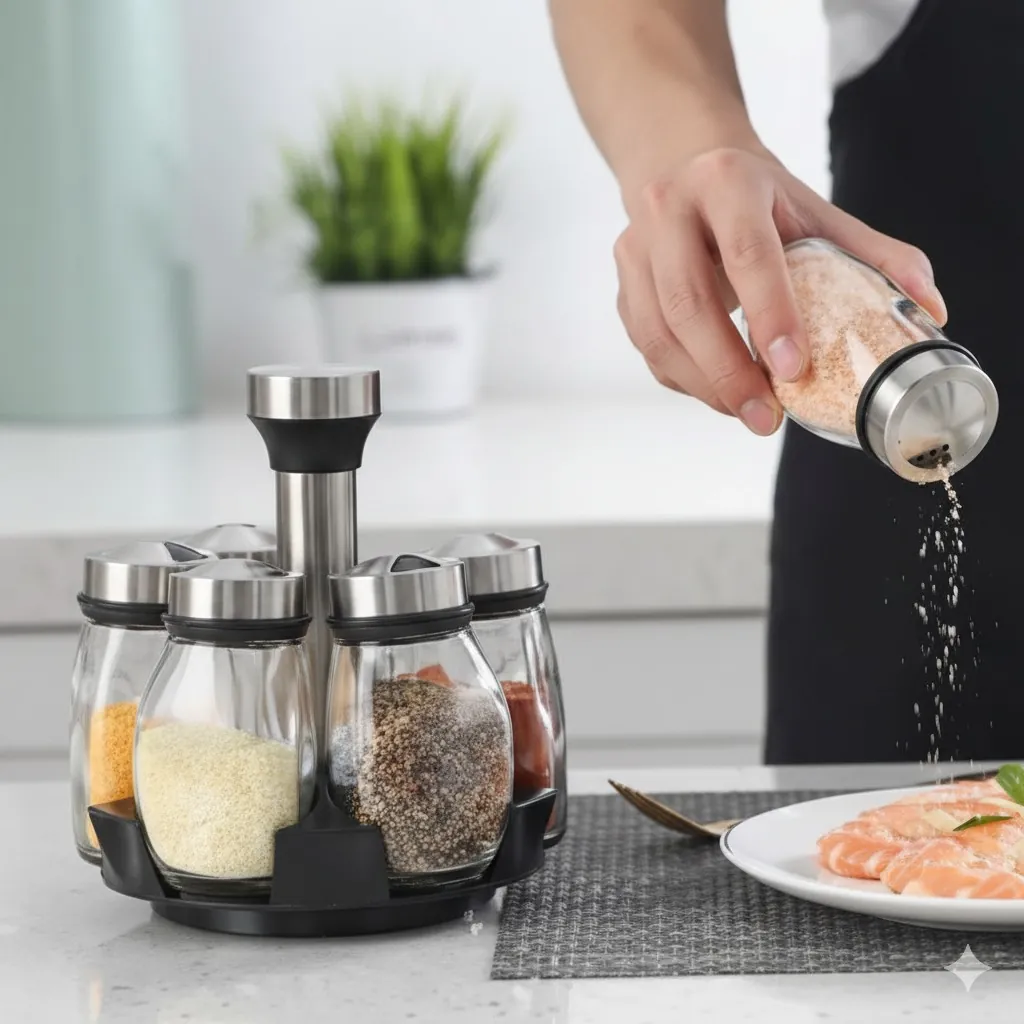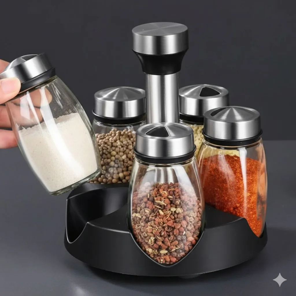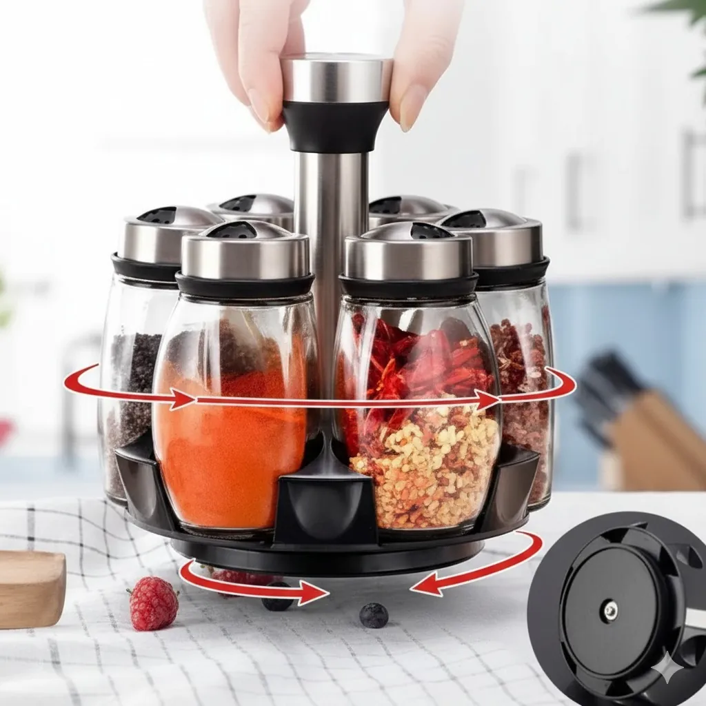 Transform your kitchen counter into an organized culinary hub with the Rotating Spice Rack Organizer with 6 Glass Jars. This elegant and practical "ABAS TECEDOR DE ESPECIA SET" (Spice Supplier Set) is designed to bring both functionality and style to your cooking space.