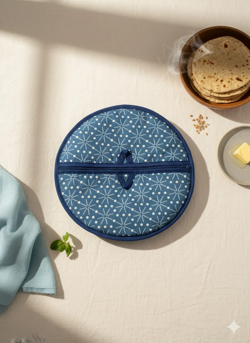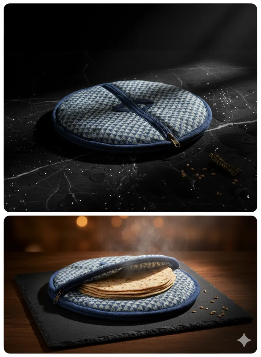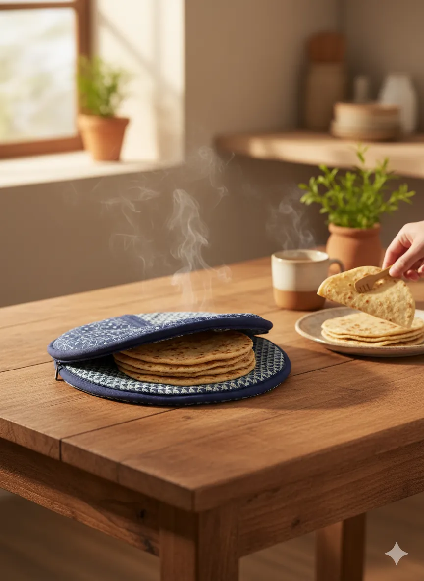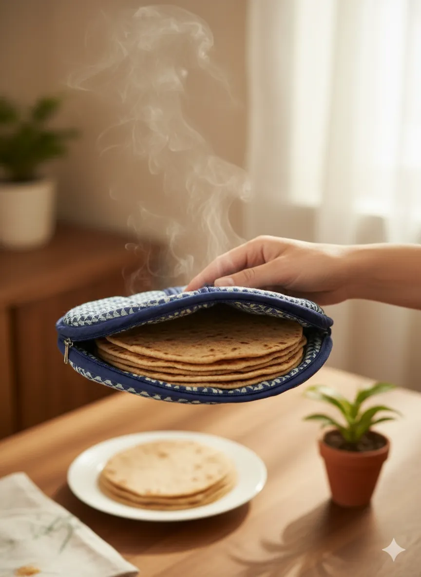 Made with double-layer insulated fabric, it maintains the temperature of rotis for hours while preventing moisture loss.