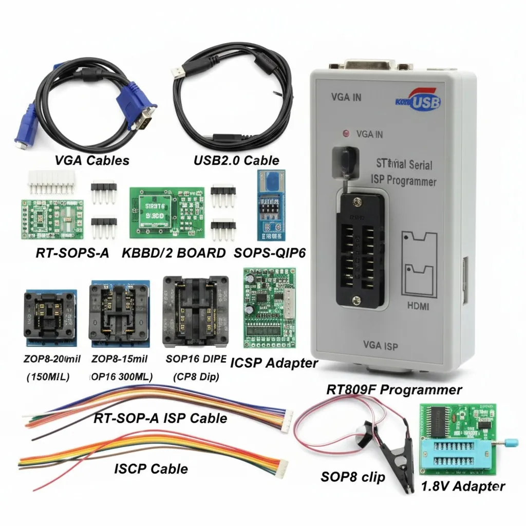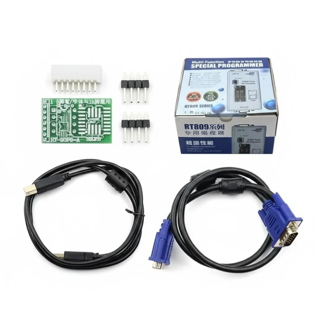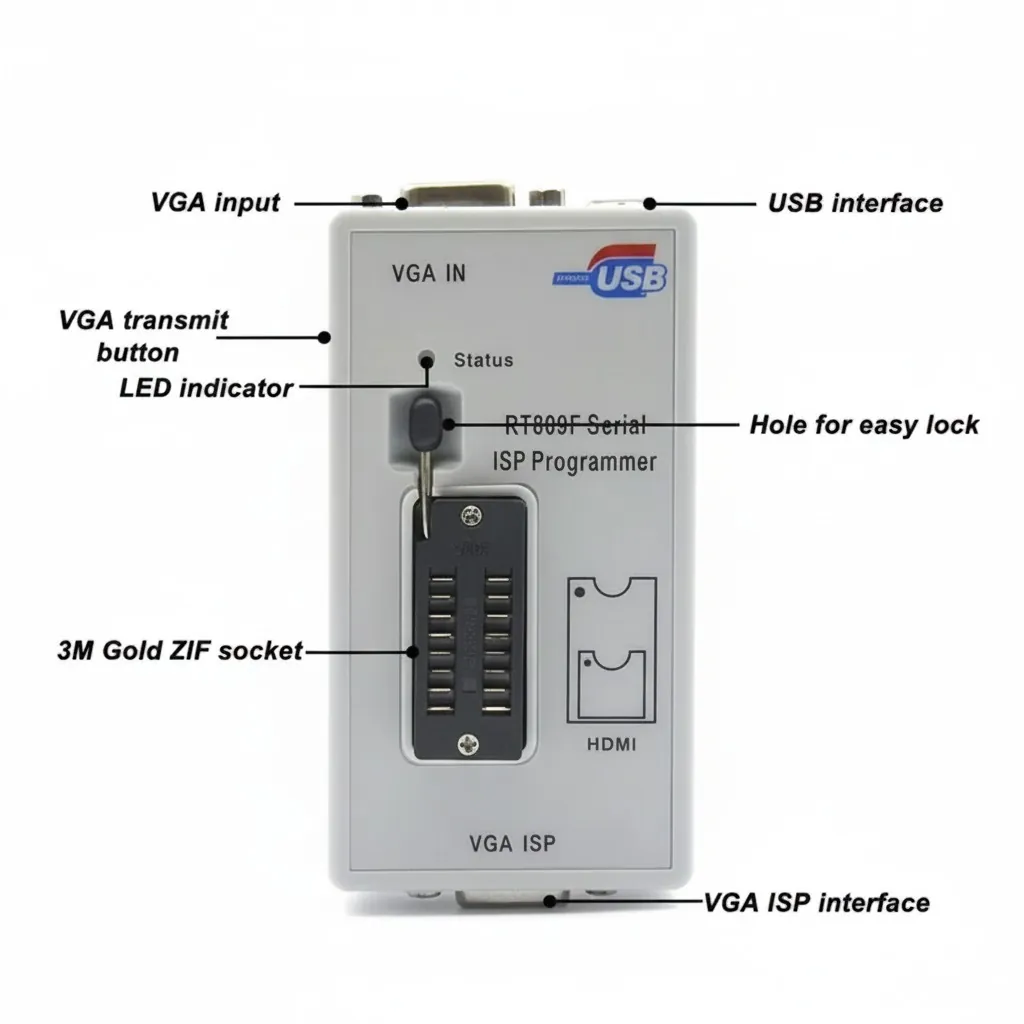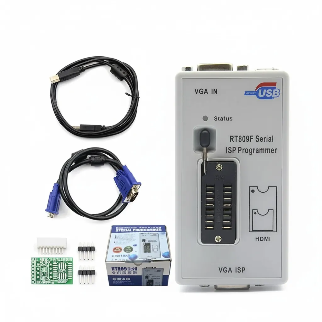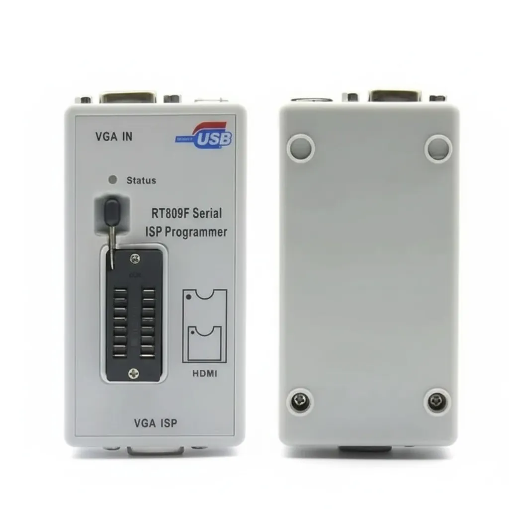 The RT809F Universal ISP Programmer is an indispensable, high-speed tool for professional electronics repair and development. It provides the ability to read and write virtually all common serial memory chips, including SPI Flash (24, 25, 26, and 93 series) and standard 8/16-pin EEPROM chips. Its core strength lies in its In-System Programming (ISP) capabilities, allowing technicians to program devices without removing the chips.The RT809F is unique in offering dedicated VGA ISP and HDMI ports, specifically designed for online programming of LCD/LED monitors and TVs, enabling program backup and restoration without opening the display unit. This feature greatly speeds up repair work on devices like Laptops, PC Motherboards, DVD Players, Routers, DVRs, and Home Appliances. The device connects via USB, features a 16-pin ZIF Socket for easy chip insertion, supports automatic chip part number identification, and is driven by user-friendly PC software with multi-language support (English, Chinese, Russian).