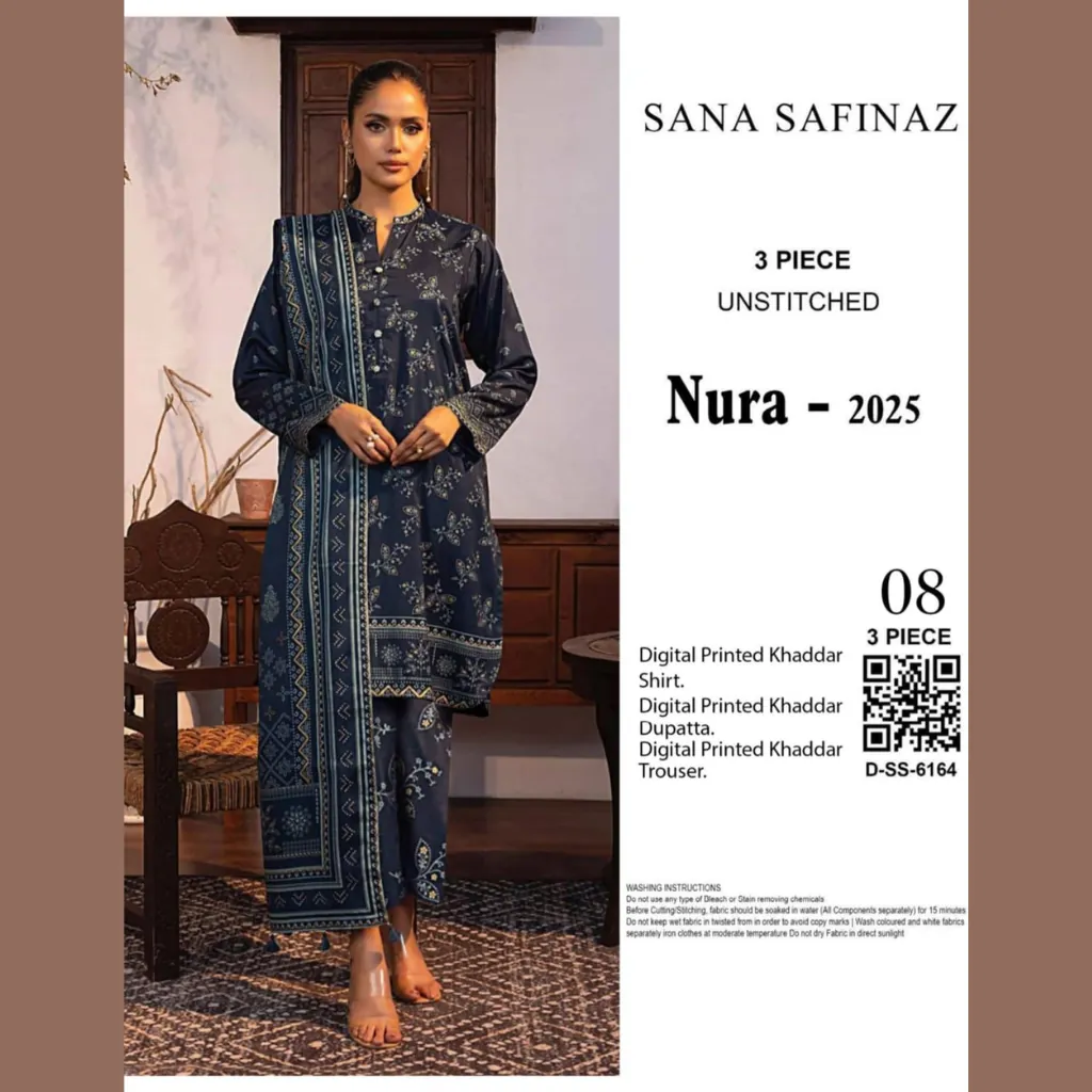 Discover the perfect blend of comfort and sophistication with Sana Safinaz Khaddar Printed Unstitched 3 Piece Collection. Designed with premium khaddar fabric, this outfit ensures warmth and style during the winter season. The beautifully printed shirt, matching trouser, and coordinating dupatta make it a versatile choice for casual gatherings and everyday elegance. A timeless addition to your seasonal wardrobe.