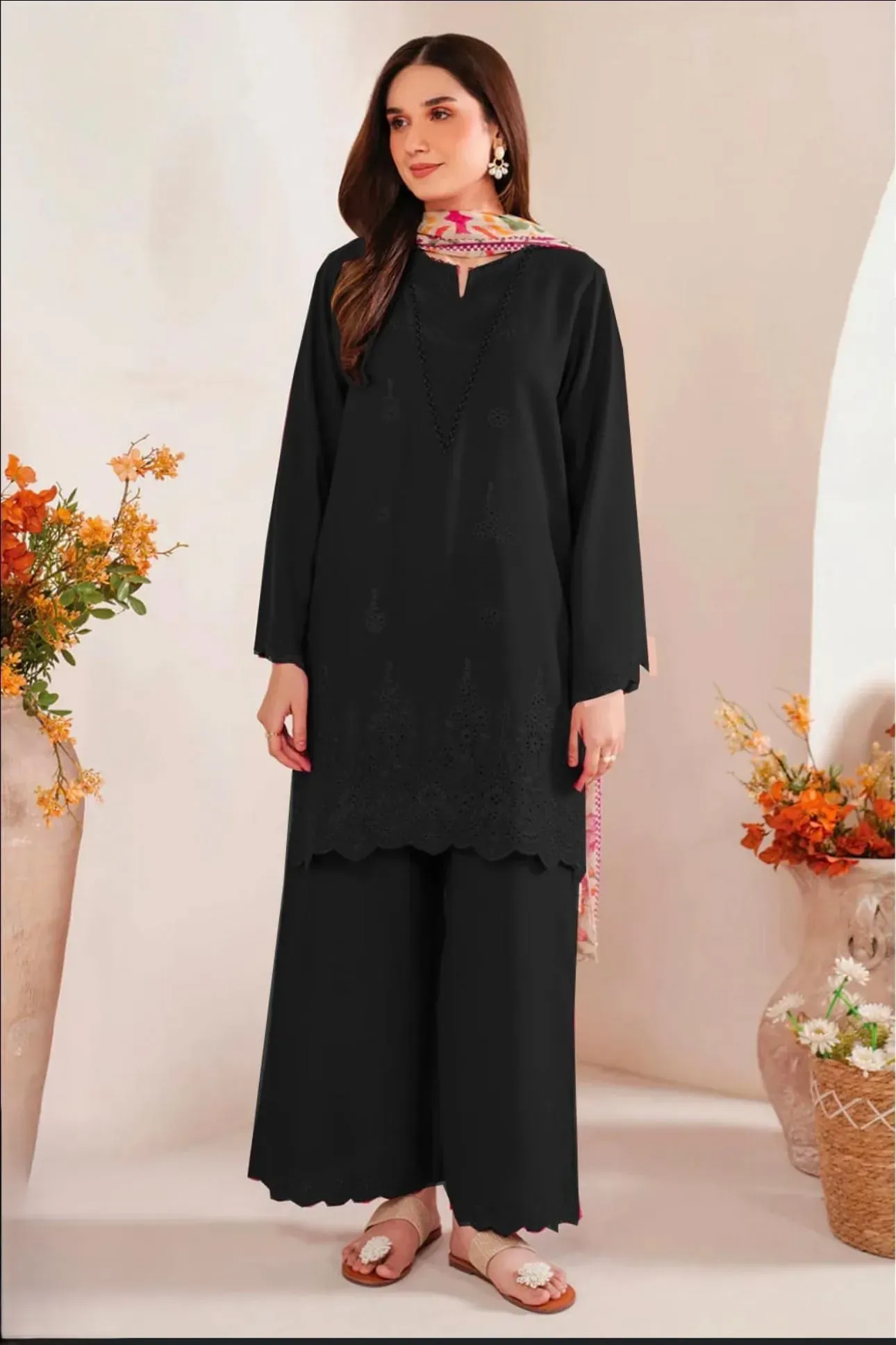 Sapphire Dhanak Fabric Embroidered 3-Piece Suit with Digital Printed Shawl | Available in Black, Red, and Magenta