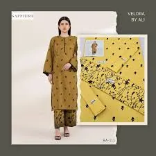 The Sapphire Digital Printed 2PC Silk Suit with Motif Design is a beautiful fusion of traditional craftsmanship and contemporary style. Crafted from high-quality silk, this 2-piece set includes a mustard yellow kameez adorned with intricate black motifs, paired with matching palazzo pants for a cohesive and elegant look. The lightweight silk fabric ensures breathability and comfort, making it ideal for extended wear during festive events or formal gatherings. The digital printing technology delivers vibrant, fade-resistant colors, while the detailed motifs add a touch of sophistication to the ensemble. Perfect for those who appreciate refined aesthetics, this suit is a must-have for special occasions.