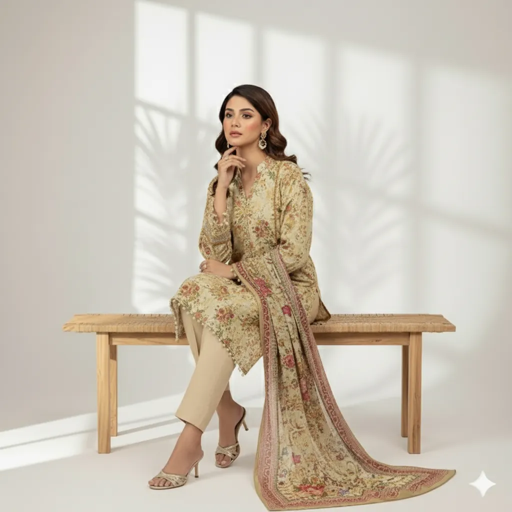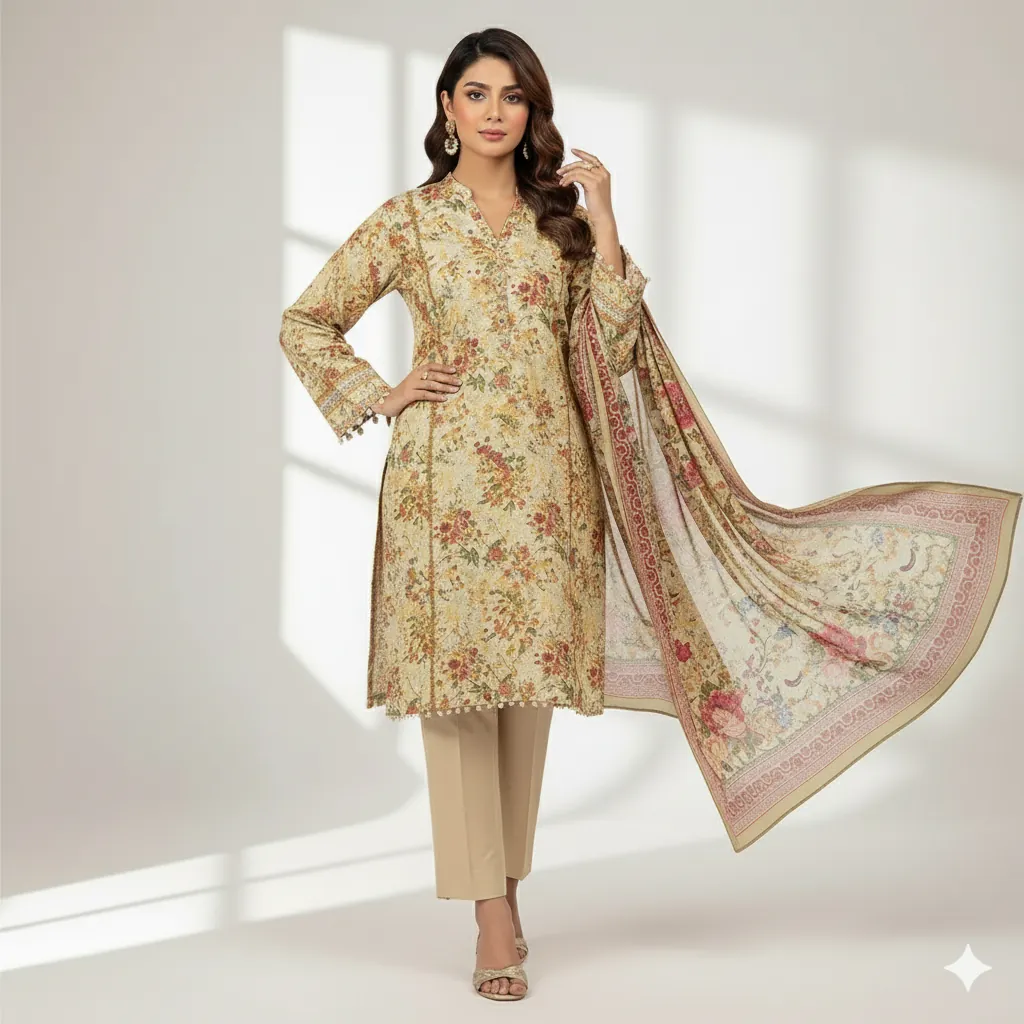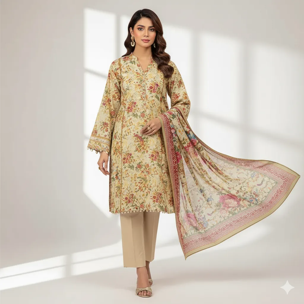 Saya 3-Piece Unstitched Lawn Suit – Beige Base with Multicolor Floral Print. Elevate your casual summer look with this stunning Saya 3-piece unstitched lawn suit. Designed with a soft beige base, the outfit showcases beautiful multicolor floral prints for a refreshing, elegant vibe. The suit comes with a digitally printed lawn shirt, matching printed lawn dupatta, and a comfortable dyed cambric trouser. Made for all-day comfort and seasonal style.