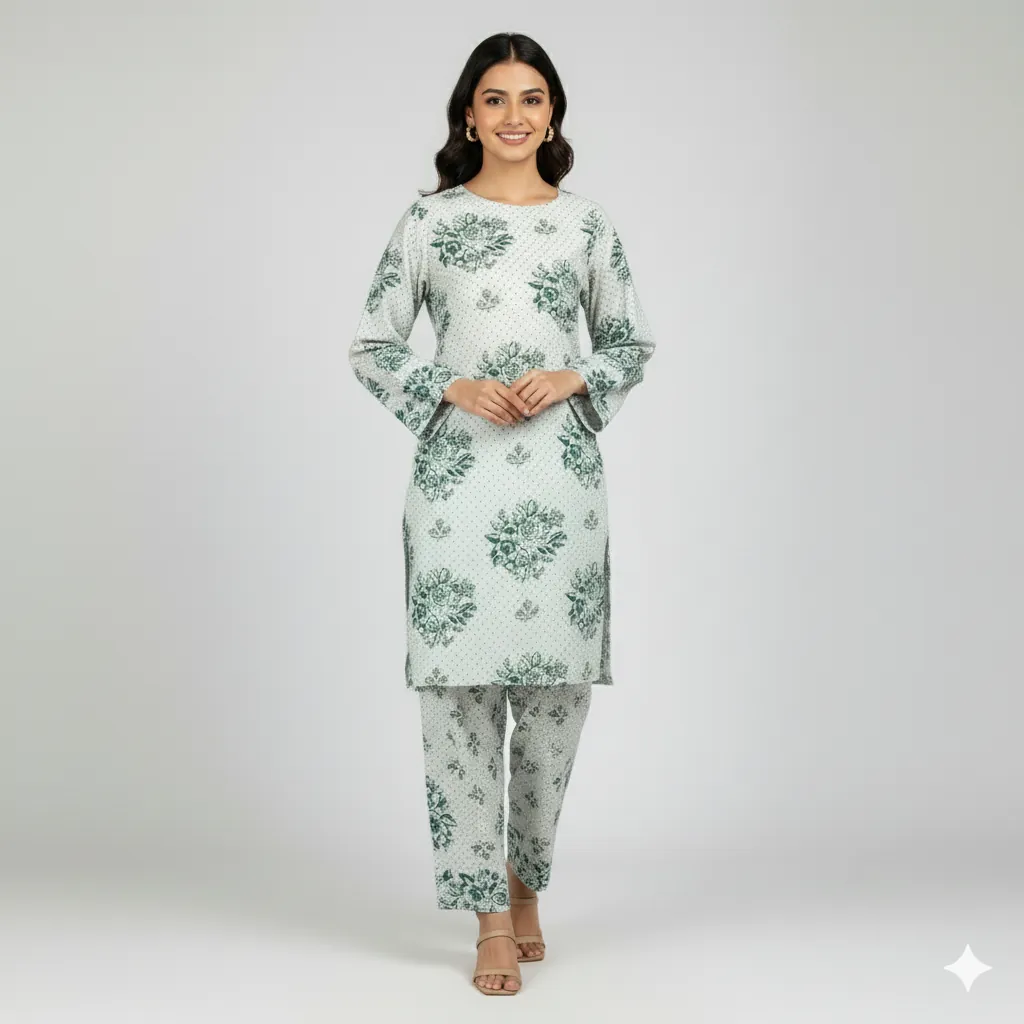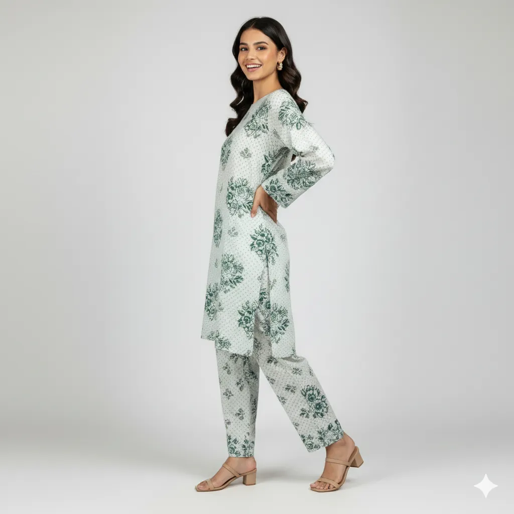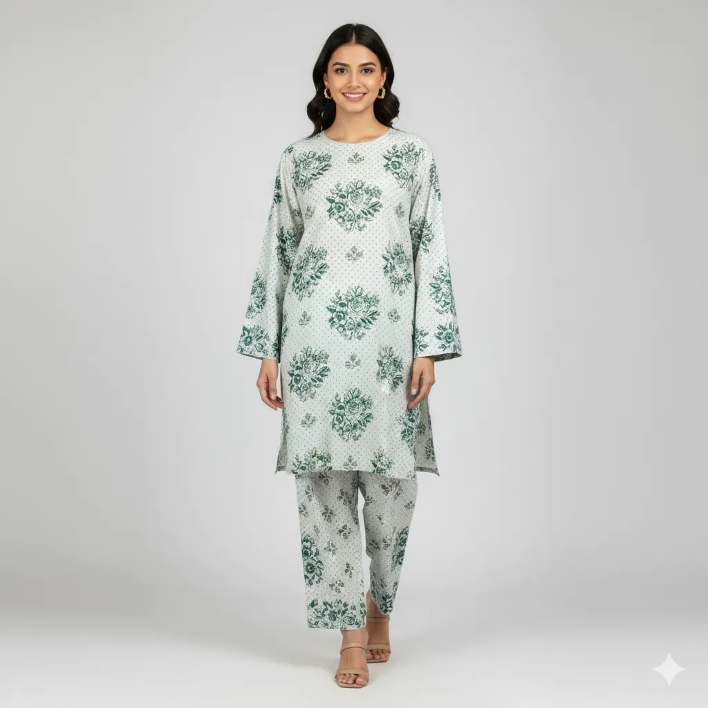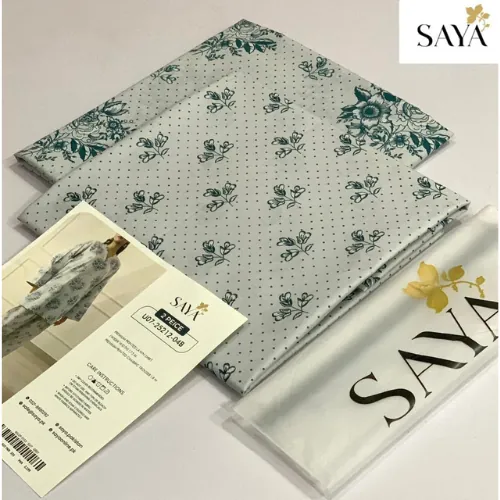 SAYA Unstitched 2-Piece Printed Lawn Suit: Light Grey with Teal Floral Print. An original SAYA unstitched 2-piece suit featuring a subtle dotted grey base with a teal floral print, complete with a matching trouser.This is an authentic, original SAYA unstitched 2-piece suit. The set includes a printed lawn shirt and a printed lawn trouser. The fabric of the shirt has a light grey or off-white base with a fine dot pattern, and a digital print of floral and leaf designs in a striking teal or dark green color. The suit is accompanied by a solid colored trouser that matches the teal/dark green of the floral print.