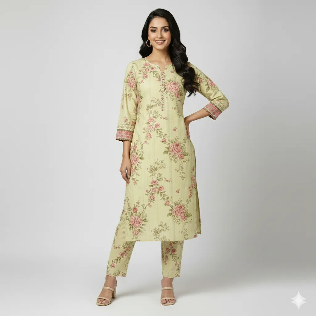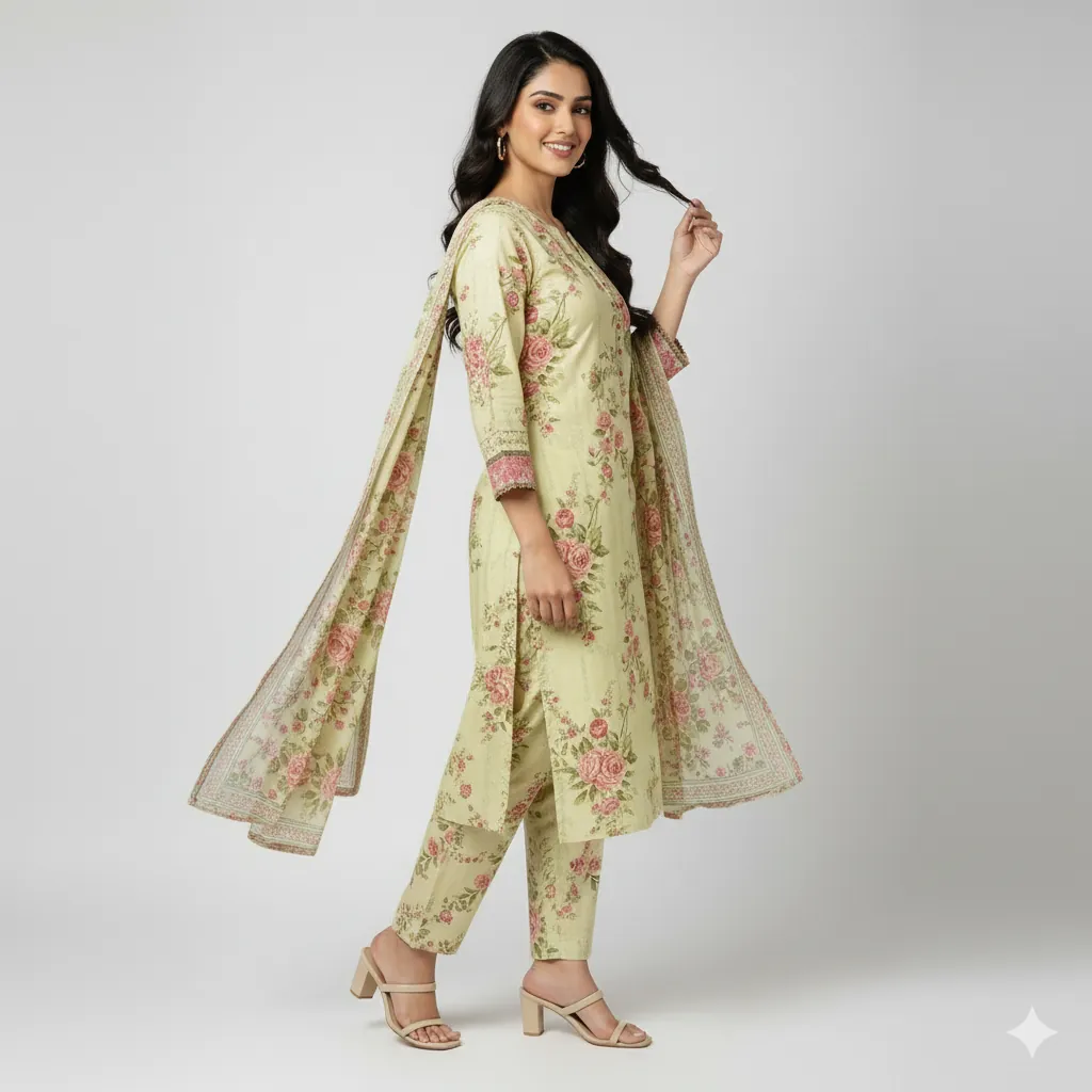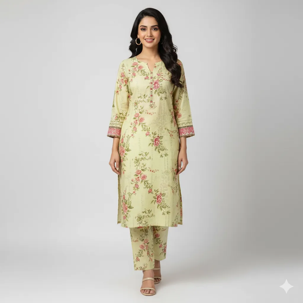 SAYA Unstitched 2-Piece Printed Lawn Suit: Pastel Yellow with Pink Floral Print. An original SAYA unstitched 2-piece printed lawn suit in a lovely pastel yellow shade, featuring floral prints in pink and green.his is an authentic, original SAYA unstitched 2-piece suit, which is ideal for a light and stylish look. The set includes a printed lawn shirt and a printed lawn trouser. The fabric has a light pastel yellow or light yellow base color with a floral print of flowers and leaves in shades of pink, rose, and green.
